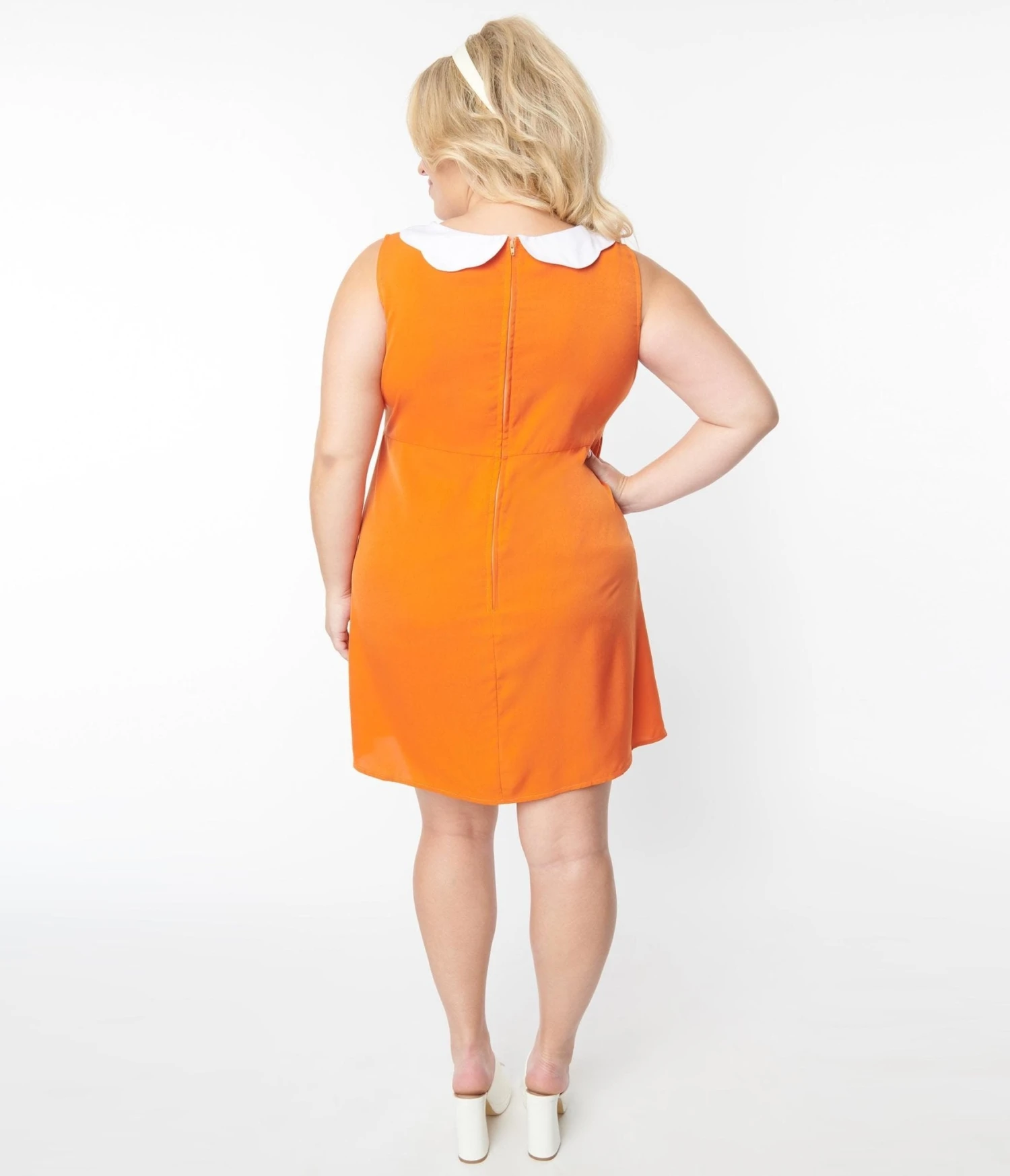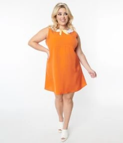 This adorable shift dress is crafted in an orange crepe fabric. The sleeveless design is accented with a contrasting white scalloped collar complete with a self tie neck bow in orange and white gingham. Complete with a back zipper!