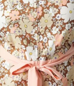This darling romper is crafted in a sturdy woven fabric that dances with pink, beige, and white florals throughout a brown backdrop. Outfitted with a front zipper, button adjustable light pink straps, an attached skirt, light pink self ties, and light pink shorts!