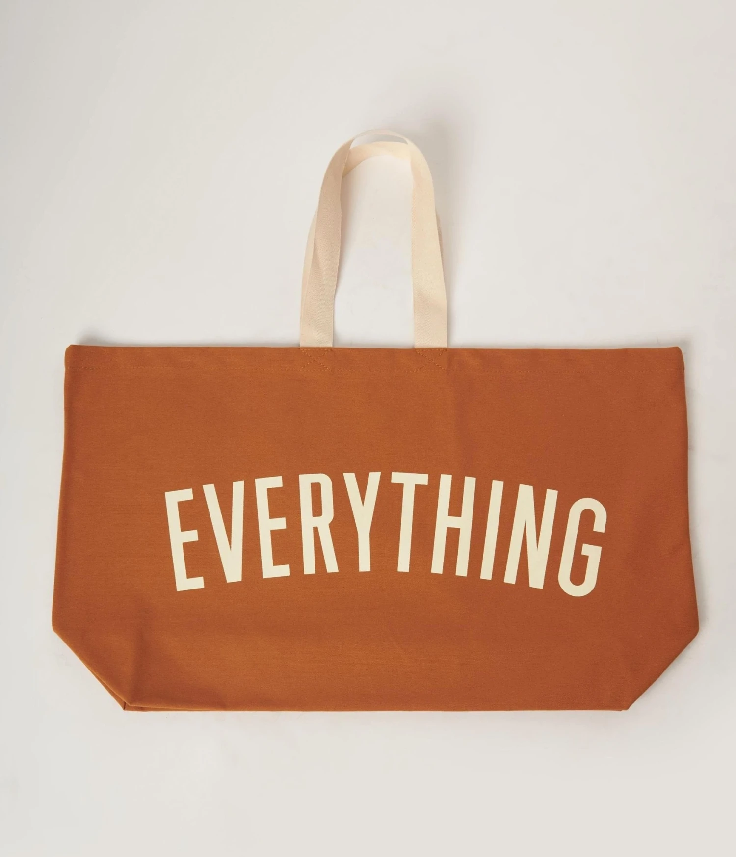 Take everything with you, literally! This tote bag is crafted in a tan cotton and features the font “Everything” in cream. Complete with dual top handles.