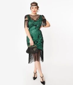 A flapper girl can’t live without her fringe, dames! Twinkling and breathtaking, this stunning flapper dress from Unique Vintage features a dazzling array of black beads and sequins throughout a dramatic 1920s silhouette. The Nadine Flapper is crafted with a black mesh overlay that creates a delightful illusion neckline over a v-neck green knit lining and adorable cap sleeves dance with long fringe to frame your feminine features. The tapered waist forms to your figure and drops to a gentle scalloped hemline that sways with long fringe. Outfitted with a back zipper, we’re ready for your next creative act!