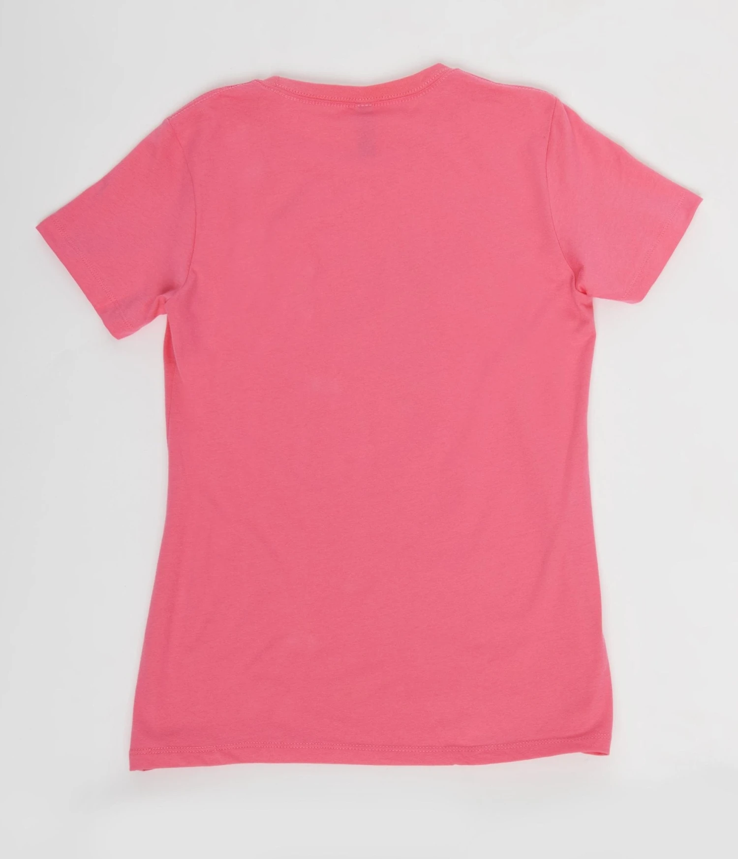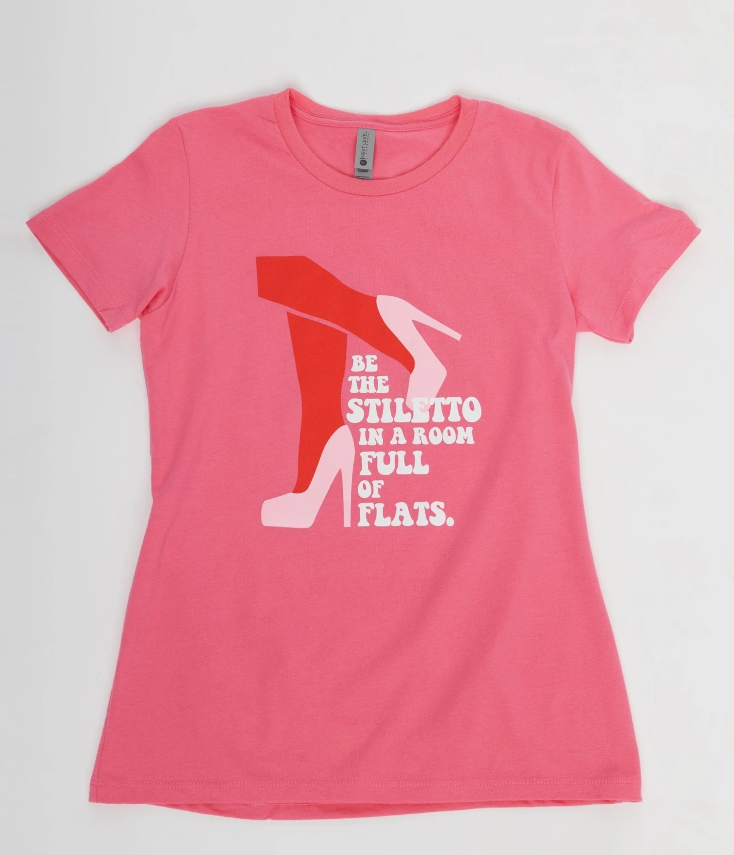 This fitted women’s graphic tee is crafted in a hot pink soft knit and boasts white font “Be The Stiletto In A Room Full Of Flats”. Complete with short sleeves and scoop neckline.