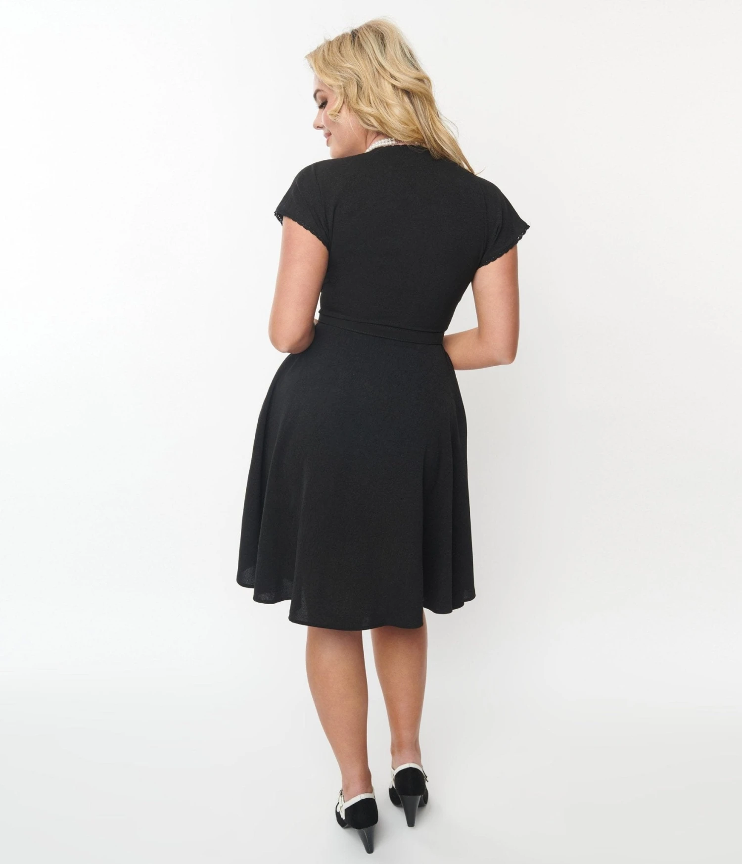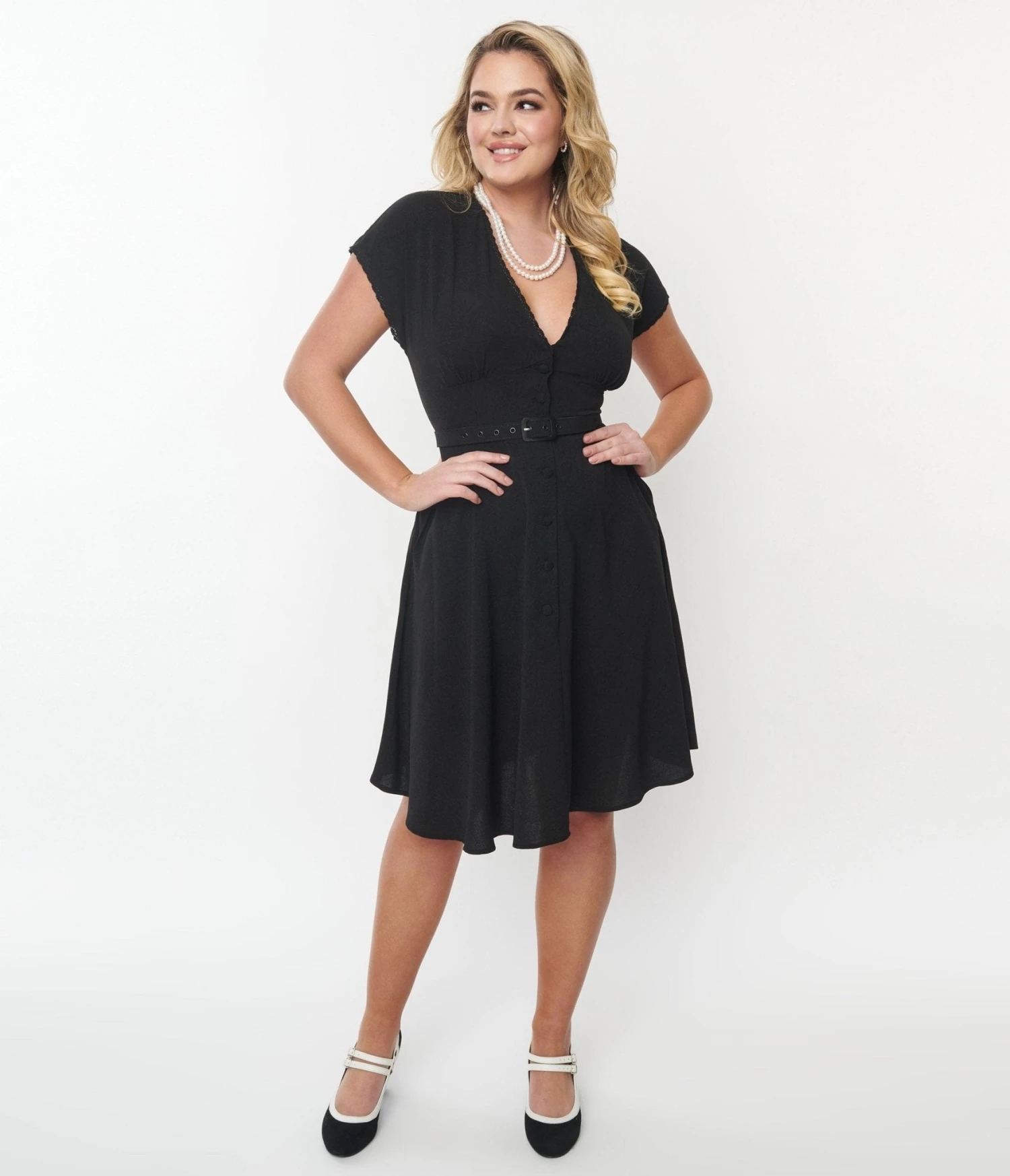 This Unique Vintage swing dress in classic black is a timeless piece perfect for any occasion! Its flattering silhouette makes it perfect for any body type while the belted waist accentuates your curves. Crafted in a black woven fabric and boasting a v-neckline with a button down front and short sleeves. Complete with side pockets and belt.