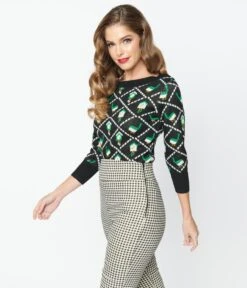 This sweet knit sweater is crafted in a soft knit black fabric that features green birds and cuckoo clocks in a diamond pattern. Complete with three-quarter length sleeves.