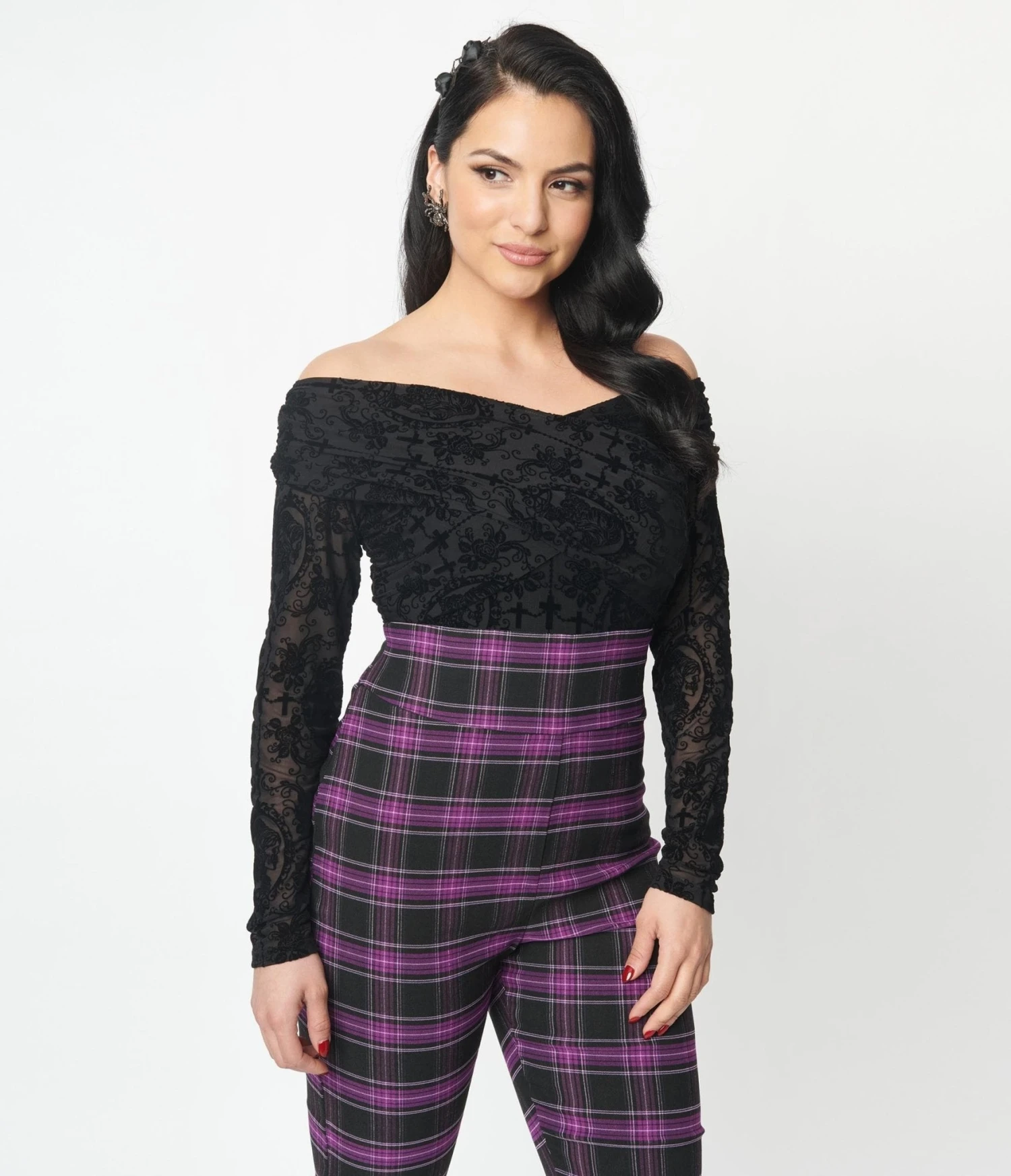 Smolder throughout the night in this alluring 1940s style bodysuit from Unique Vintage. Crafted in a fabulous black knit and mesh, dancing with the regal La Catrina throughout. The Saturday Night Bodysuit features an off the shoulder neckline and slender long sleeves while the gathered surplice neckline lends feminine flair. Complete with a dual snap button closure for easy pairing with your favorite skirt or skinnies!
