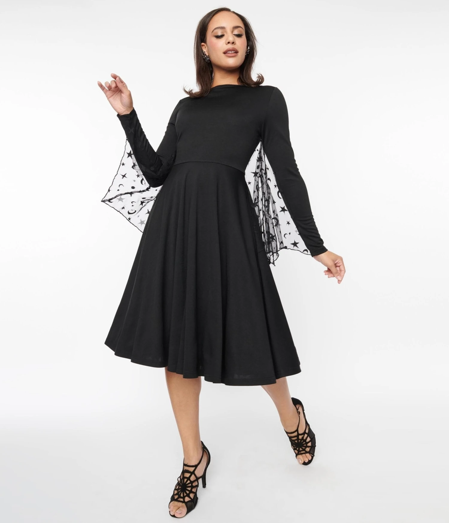 A bewitching and chic swing dress crafted in a lightweight black woven that features mesh bat wings that dances with flocked moons and stars throughout. Complete with a back zipper!