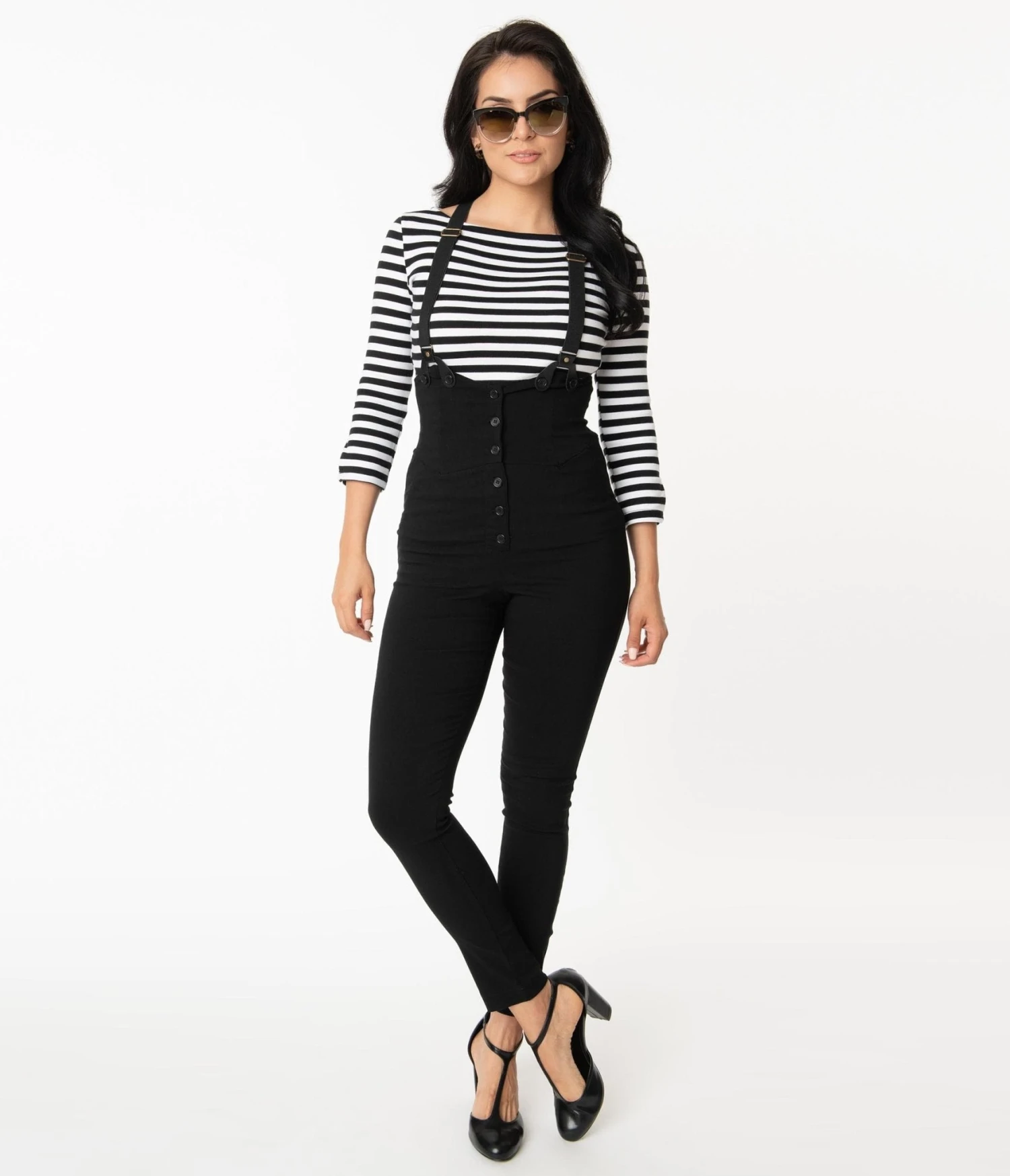 There is nothing more infectious than a good example, gals! An alluring set of skinnies, this ravishing separate from Unique Vintage will get them talking. The Moorehead Pants are crafted in a marvelous black stretch fabric to flatter your feminine curves while the sensational high waist is secured with removable and adjustable suspenders straps for versatile wear. The button up front provides eye-catching embellishment while back pockets keep this functional. Complete with a skinny leg fit, there’s no cure for fabulous!