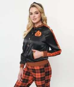 Unique Vintage Black & Orange Scream Queen Satin Bomber Jacket