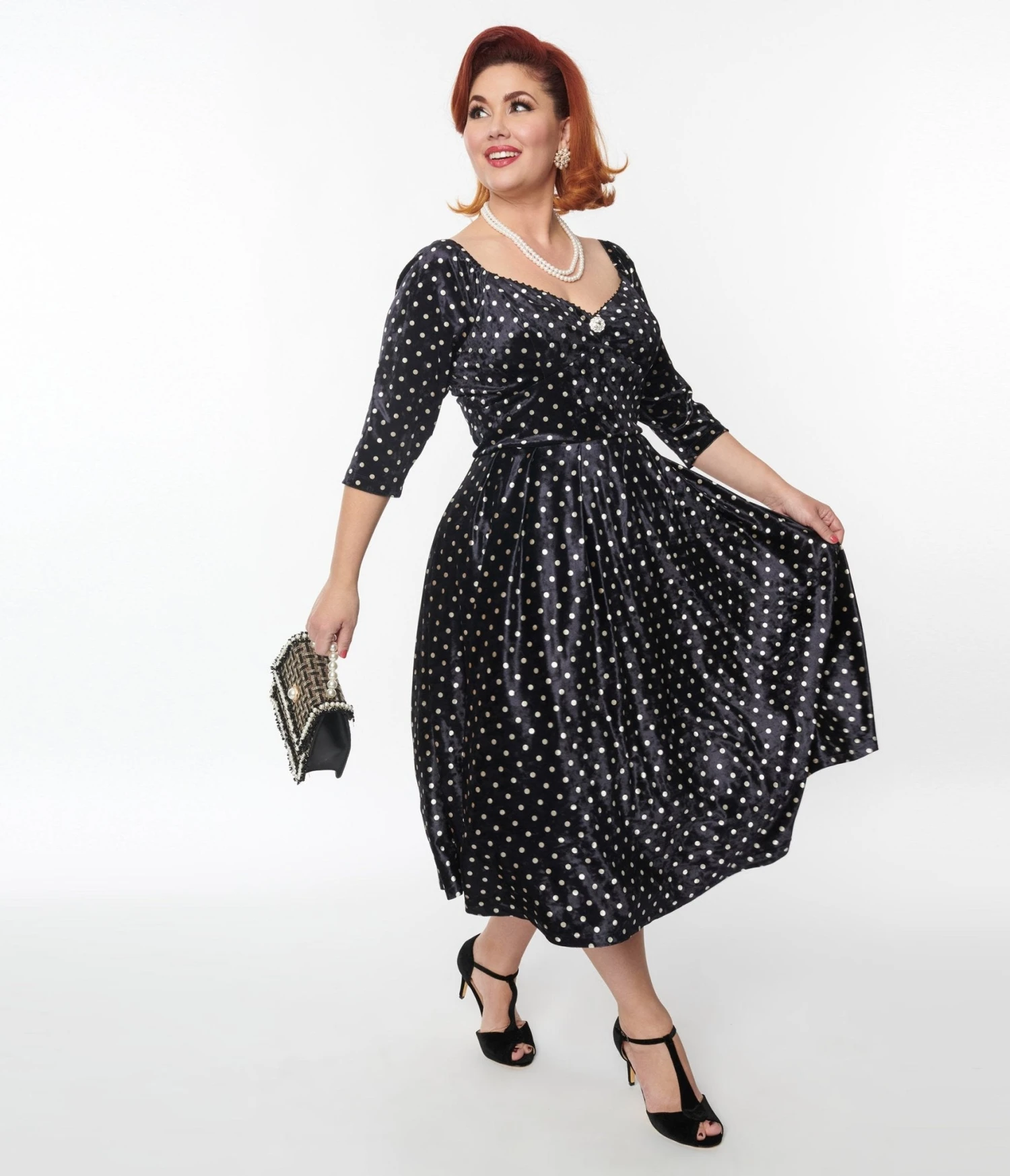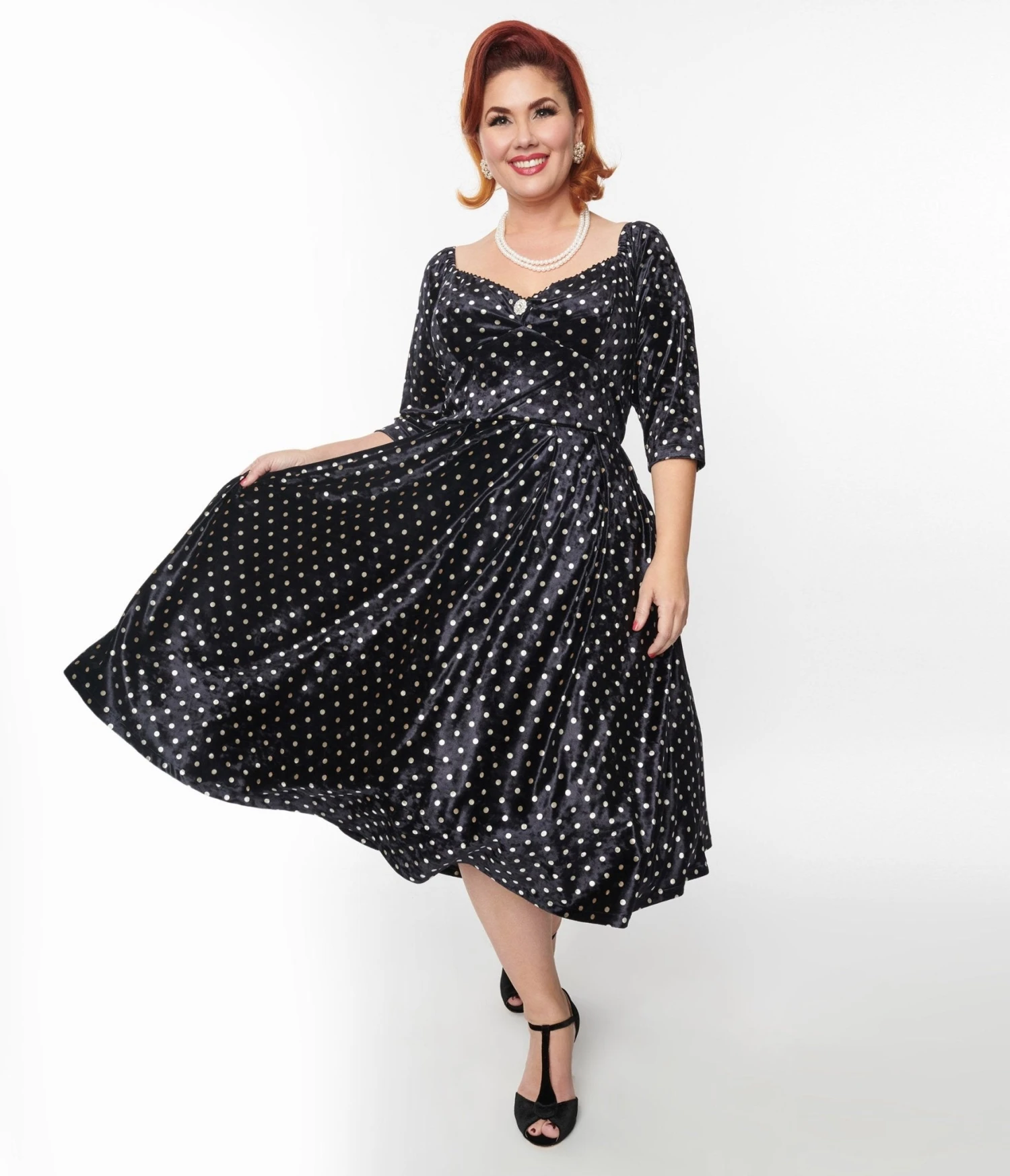 Unique Vintage Black & White Polka Dot Velvet Lamar Swing Dress