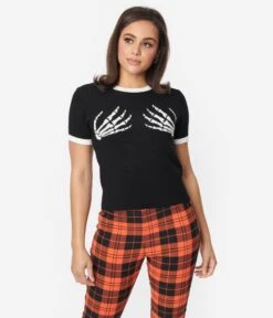 This superbly soft 1950’s style sweater is cast in a black knit blend and boasts two white skeleton hands with white trim on the cuffs and collar. Stay in place ribbing highlights the classic crew neckline, comfortable short sleeves, and straight hem.