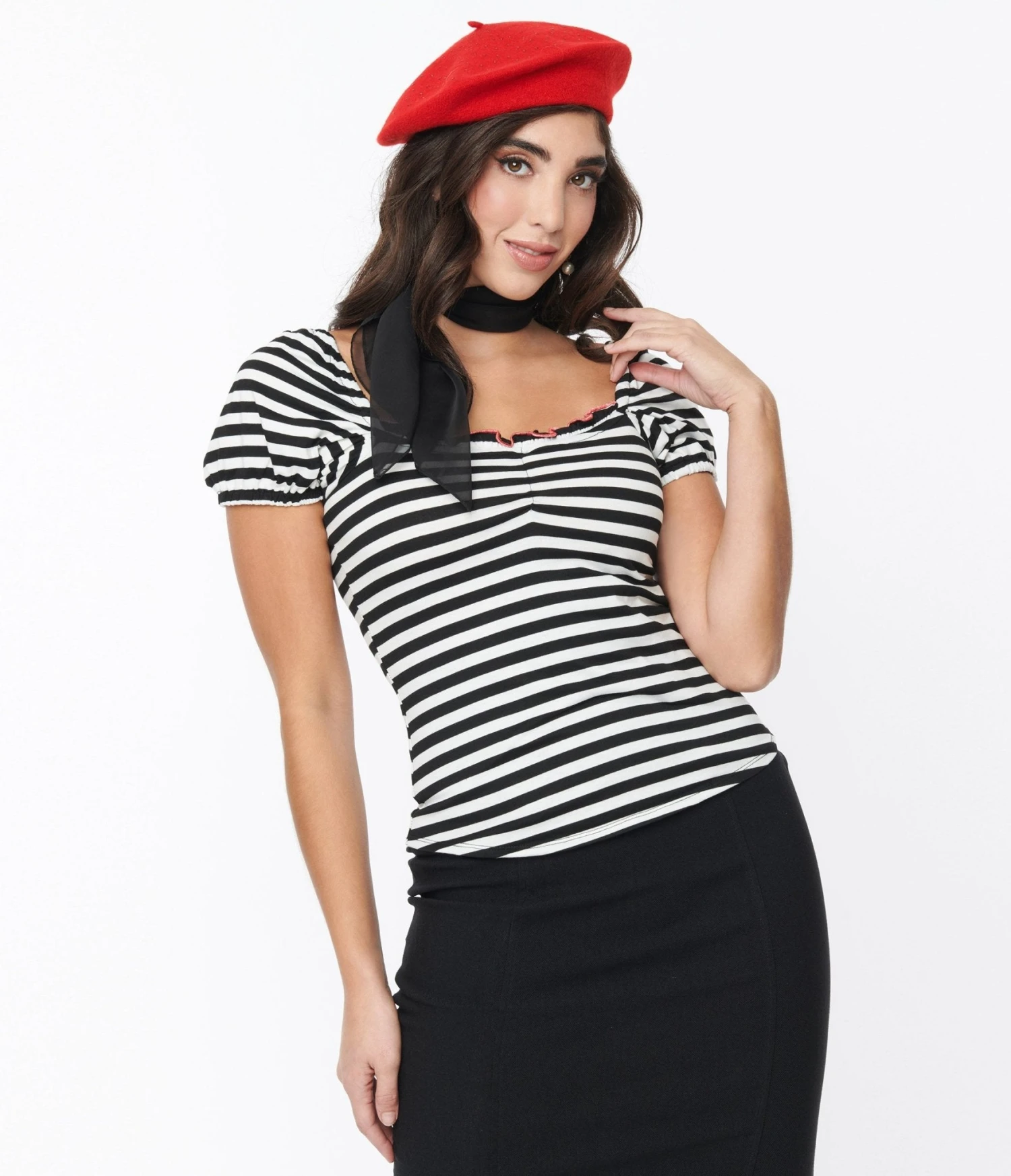 Pair your future with romance, dames! This sweet 1950’s style separate from Unique Vintage is crafted in a soft black & white striped knit fabric. The flirtatious sweetheart neckline is embellished with dainty ruffles and trimmed with red thread while the short sleeves are outfitted with elastic cuffs and shoulders for versatile styling!