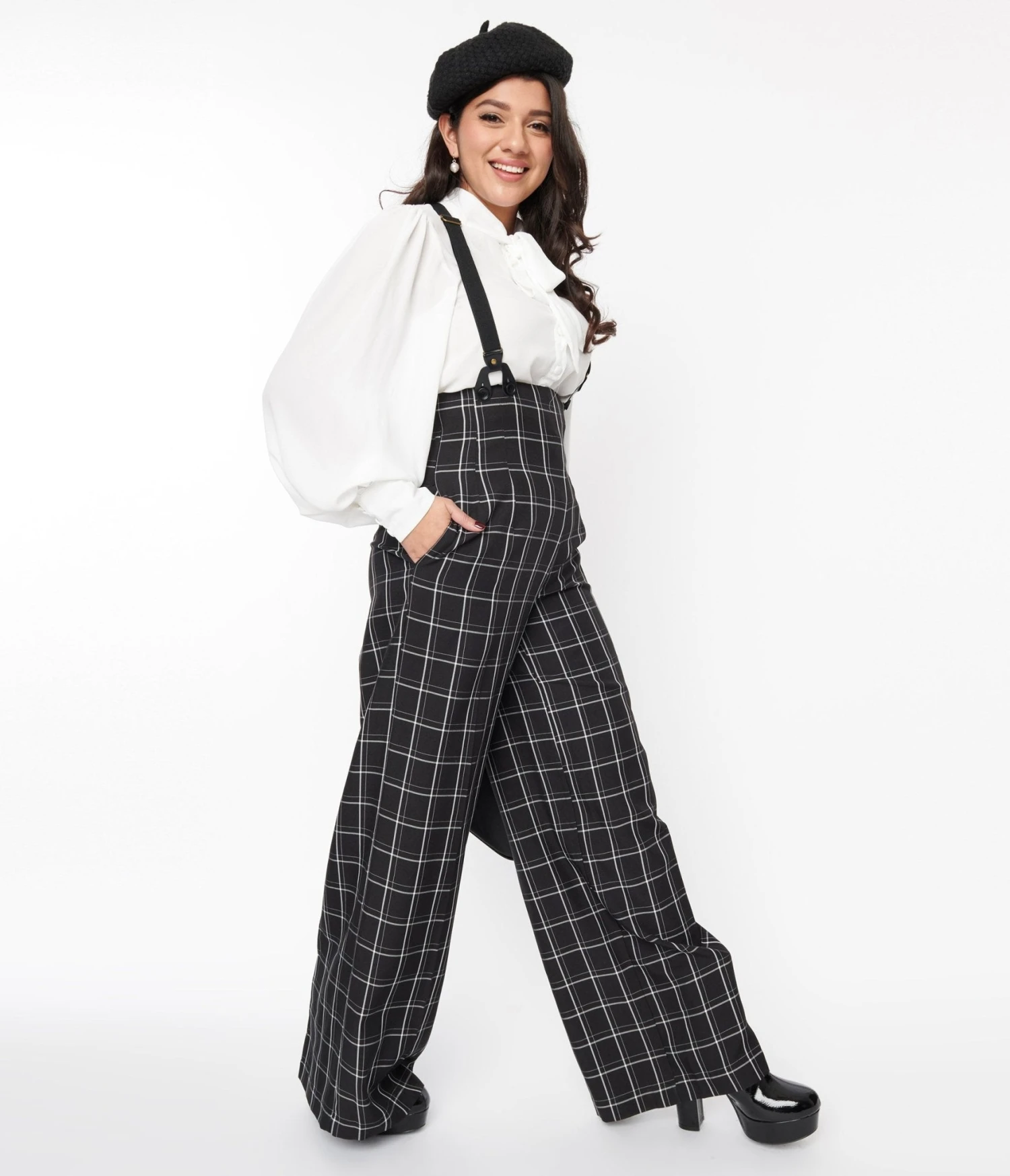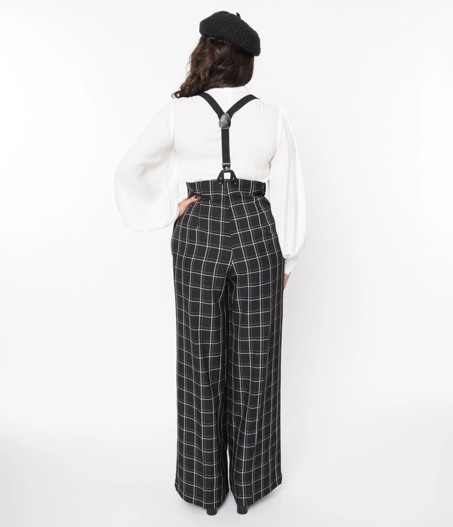 Unique Vintage Black Windowpane Plaid High Waist Suspender Trouser