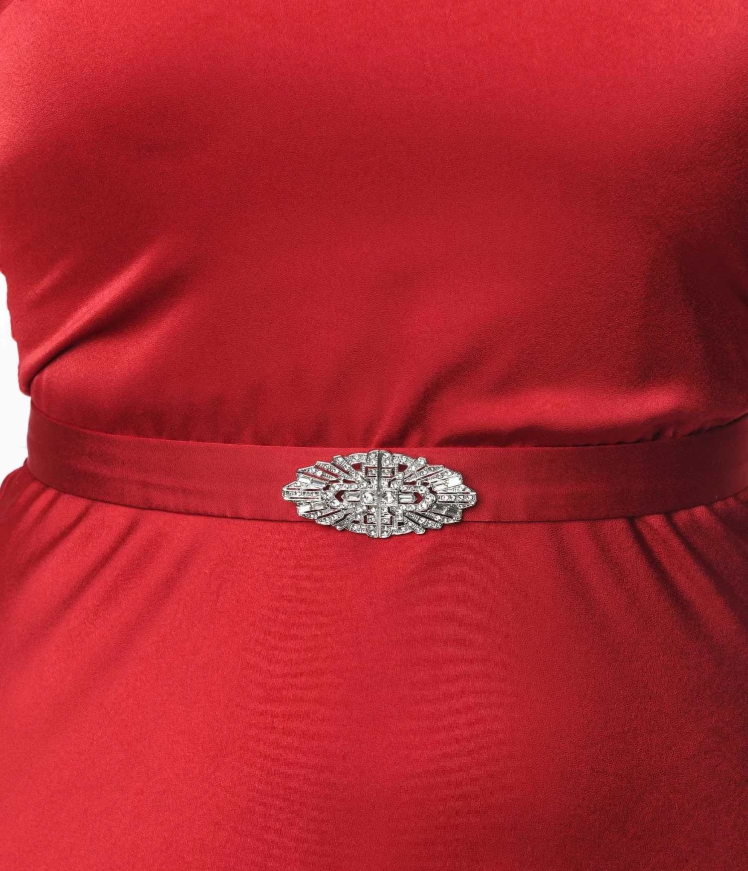 This showstopping 1930s inspired maxi gown is set in a breathtaking burgundy satin-like fabric. The attached rhinestone accented belt nips the waist, while the scoop neckline and sleeveless design leave a little allure. Complete with a back zipper.