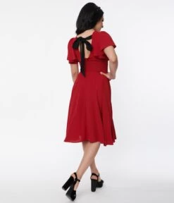 This elegant 1940s style swing is crafted in a red lightweight crepe accented with a charming rhinestone bat brooch. A black back tie and back zipper lend a cinch as the side pockets complete this silhouette.