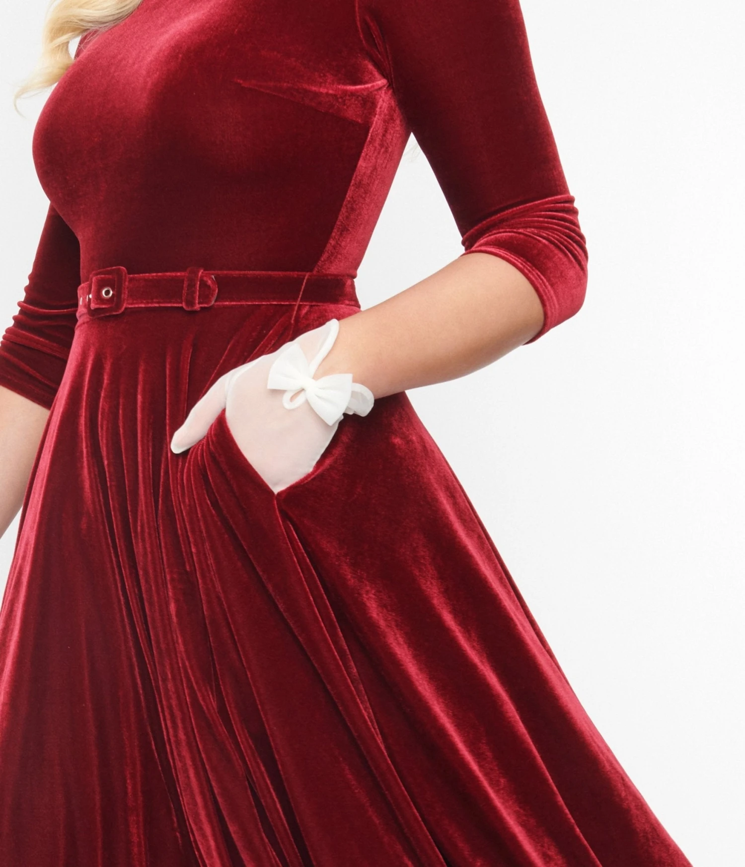 Devon’s got a relentless drive, gals! A fantastically faithful 1950’s silhouette from Unique Vintage, the Devon Dress is a sultry swing full of unstoppable beauty. Cast in a marvelous burgundy velvet stretch knit provides an enchanting and eye-catching embellishment to your figure with a darted bodice and dramatic bateau neckline that drops into a sultry V in the back. The sleek three-quarter length sleeves allow for cheeky pin-up posing as the dynamic swing skirt drops to your knees with ample room for a petticoat pop. Outfitted with hidden side pockets, a back zipper, and a charming belt to cinch in your form, drive it like you stole it!