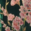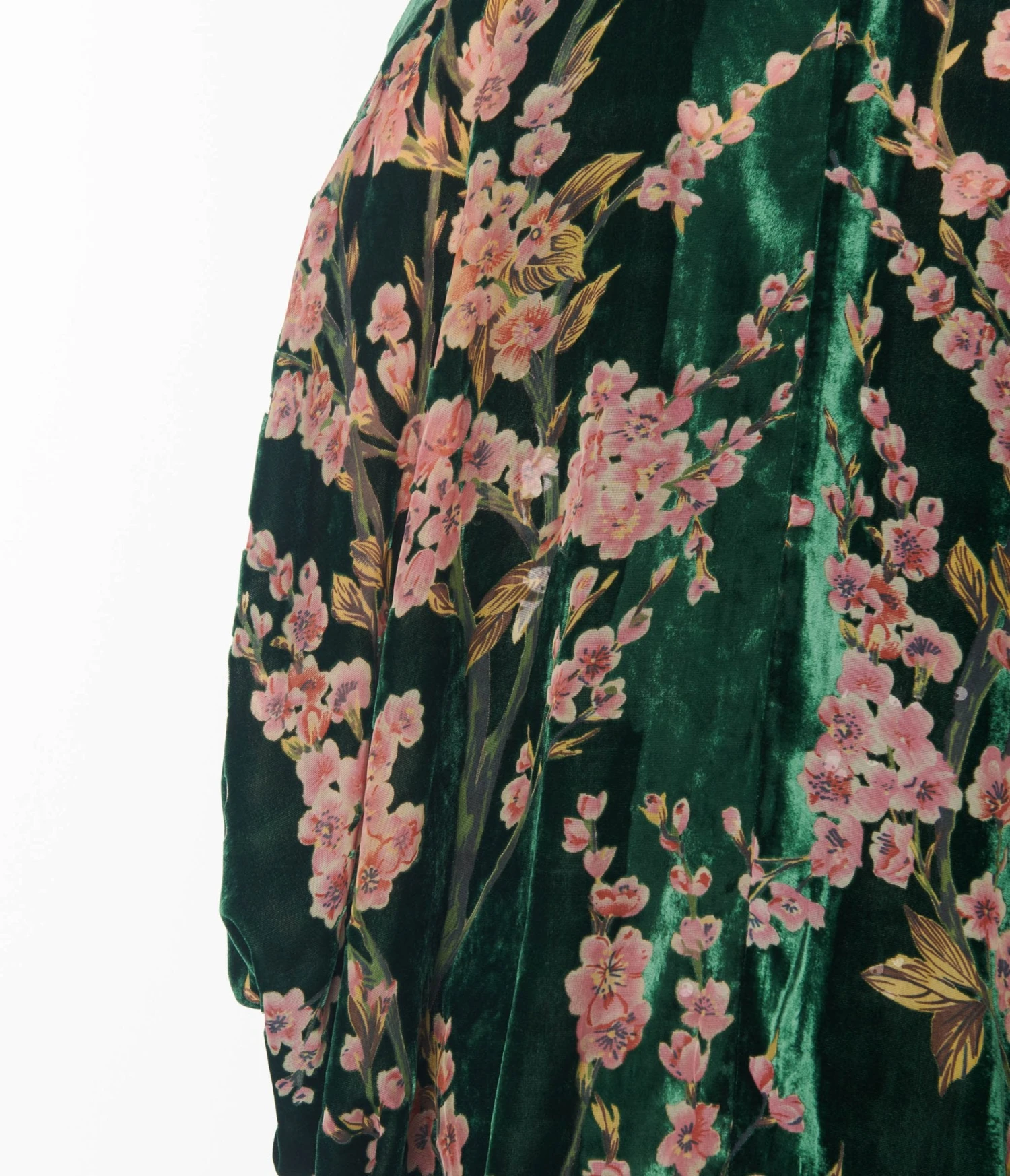 This beautiful 1950s style cocoon kimono is crafted in a stunning emerald green burnout velvet adorned with pink cherry blossoms throughout. Complete with an open front and quarter sleeves.