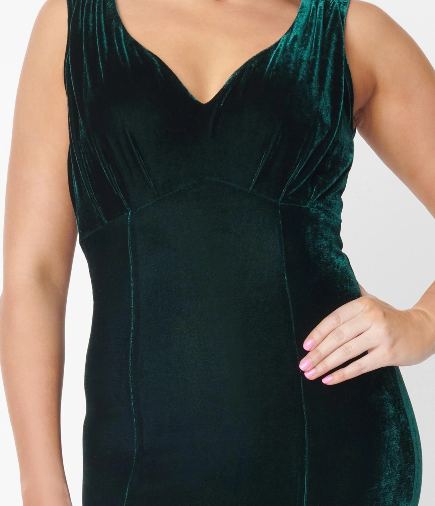 Pave the way for Goldwyn, dames! This elegant vintage style gown from Unique Vintage, is crafted in a sultry fitted emerald green velvet. The sultry curves of this classic 1930s silhouette flatter your form with paneled seaming and empire seamed waist. The exquisite V-neckline and sleeveless design compliment the luxurious subtle draped back. Complete with a hidden side zipper to cinch you in. Play your best in the Goldwyn Gown!