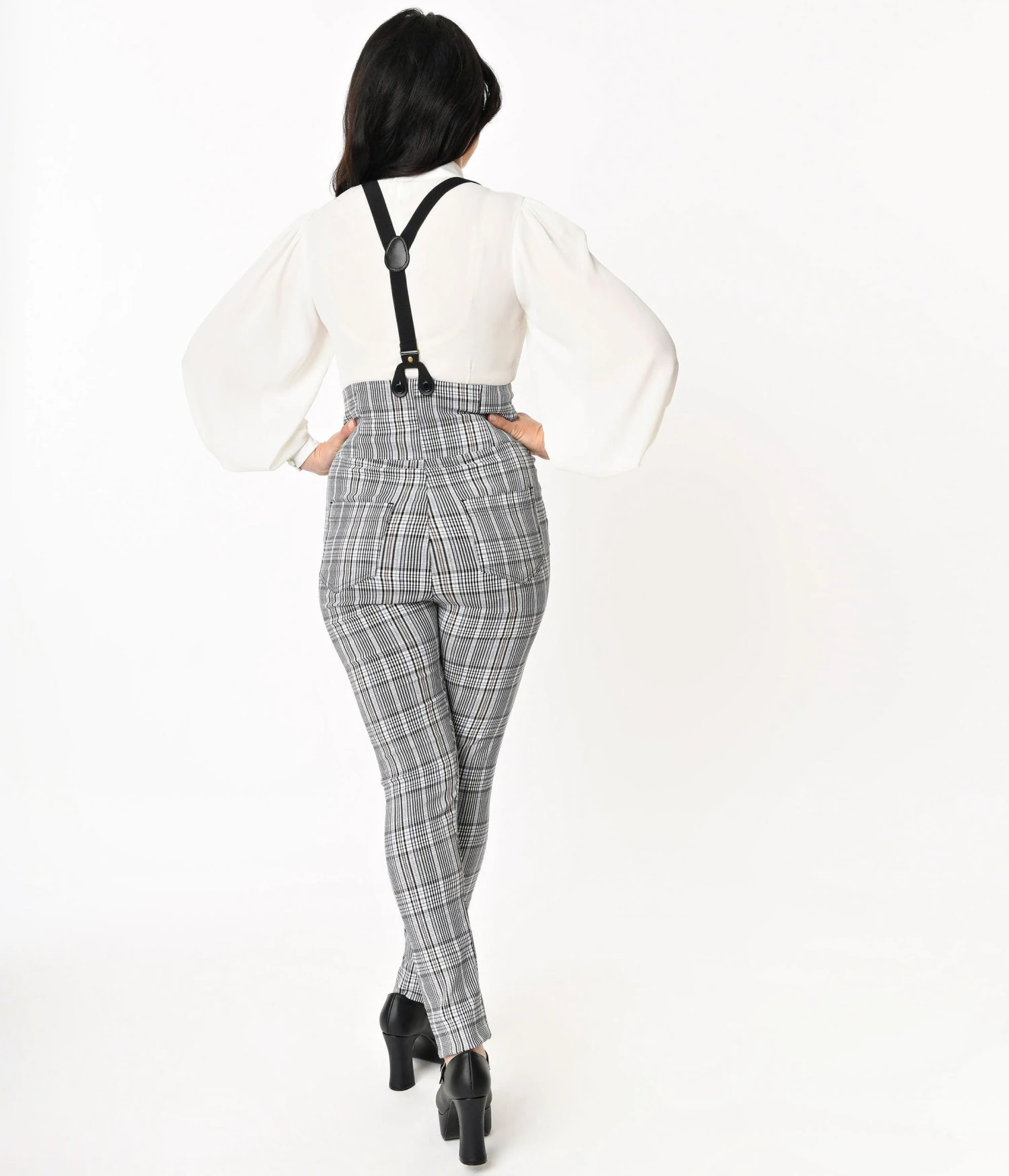 There is nothing more infectious than a good example, gals! An alluring set of skinnies, this sensational separate from Unique Vintage will get them talking. The Moorehead Pants are crafted in a marvelous stretch fabric to flatter your feminine curves with a beautiful black, white, and blue plaid pattern, while the ravishing high waist is secured with removable and adjustable suspenders straps for versatile wear. The button up front provides eye-catching embellishment while back pockets keep this functional. Complete with a skinny leg fit, there’s no cure for fabulous!