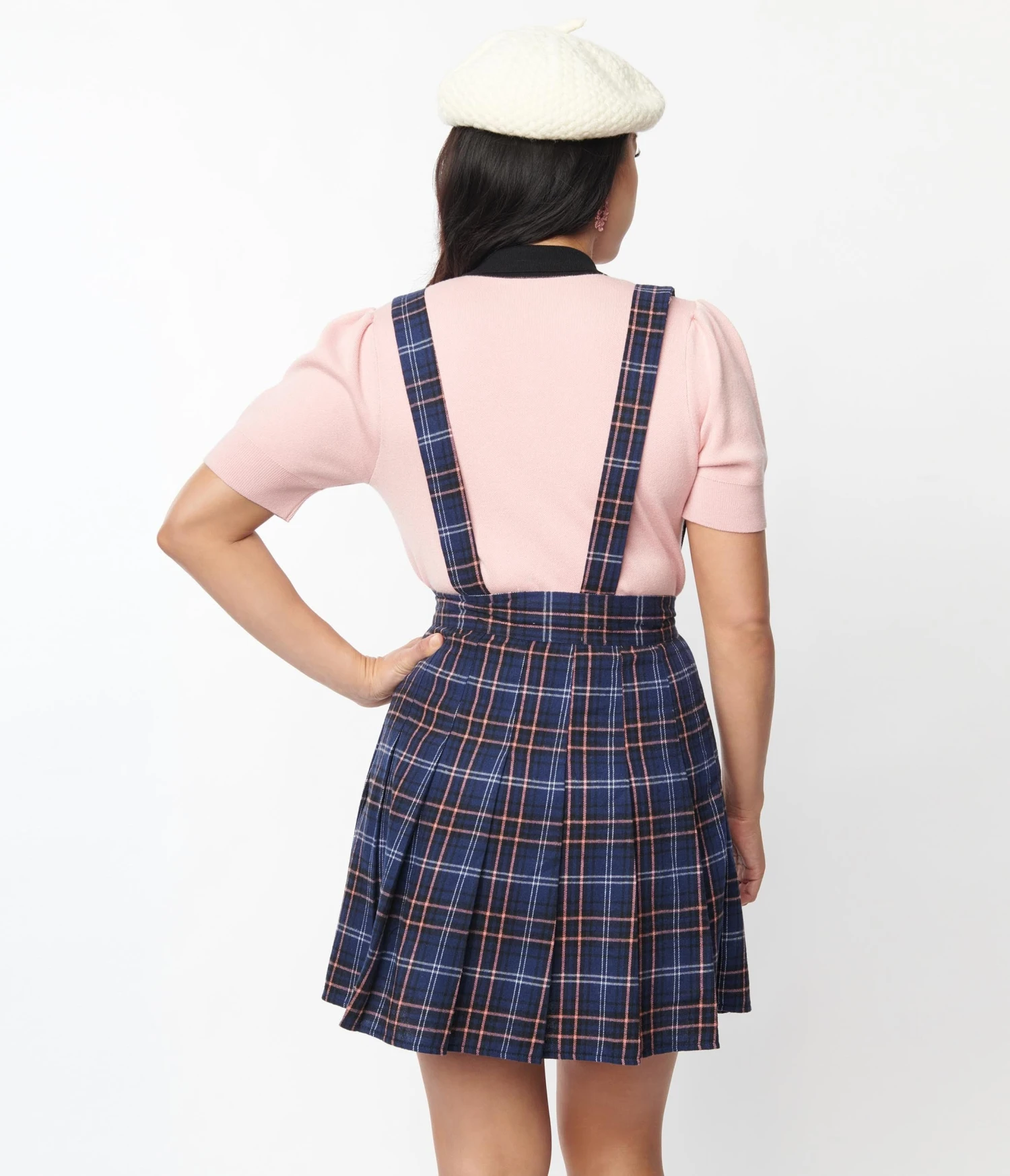 Unique Vintage Navy Plaid Pleated Suspender Mini Skirt
