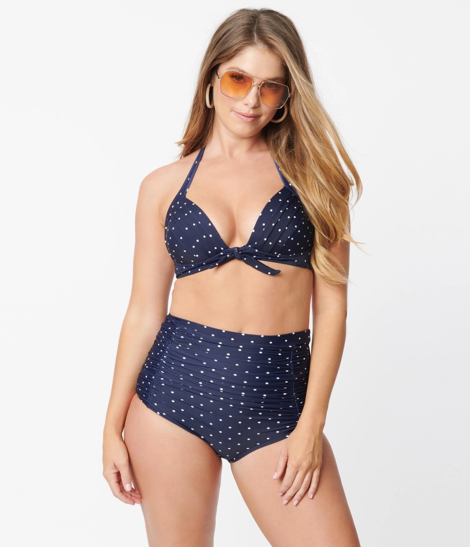 Unique Vintage Navy & White Pin Dot Monroe High Waist Swim Bottom