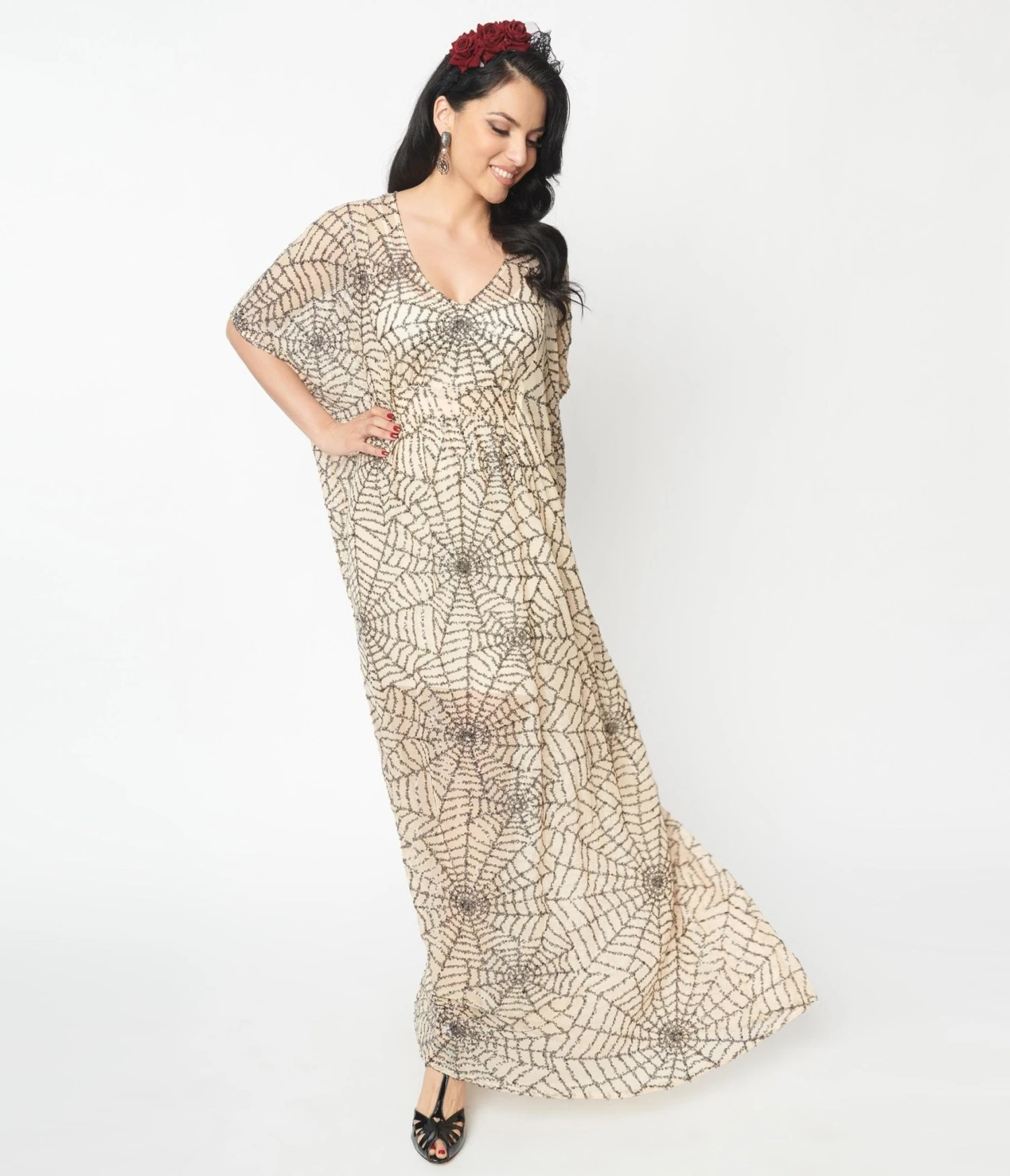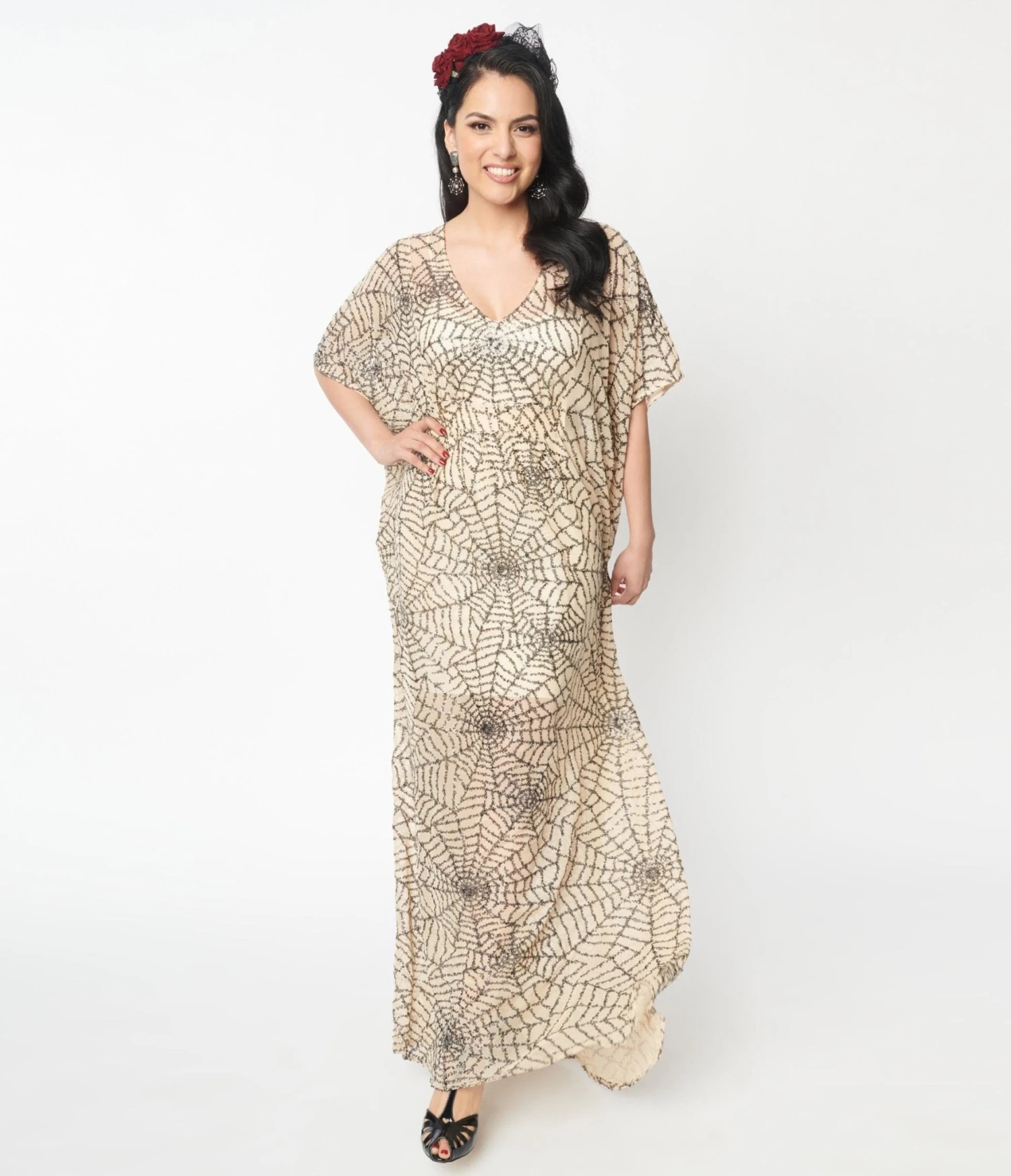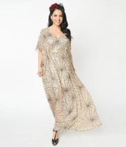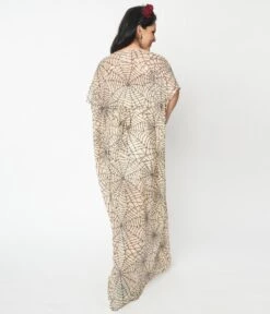 Get spooky, gals! Fall in love with this dreamy caftan frock from Unique Vintage. The Burton Dress is crafted in a lightweight sheer woven that dances with black sequin spiderwebs that cascade through the nude backdrop of this 1960s style silhouette. The sultry V-neckline is framed by sweeping half sleeves and is nipped in the waist with self ties for a marvelous fit. Dropping to your ankles, it’s vintage wear transcended!