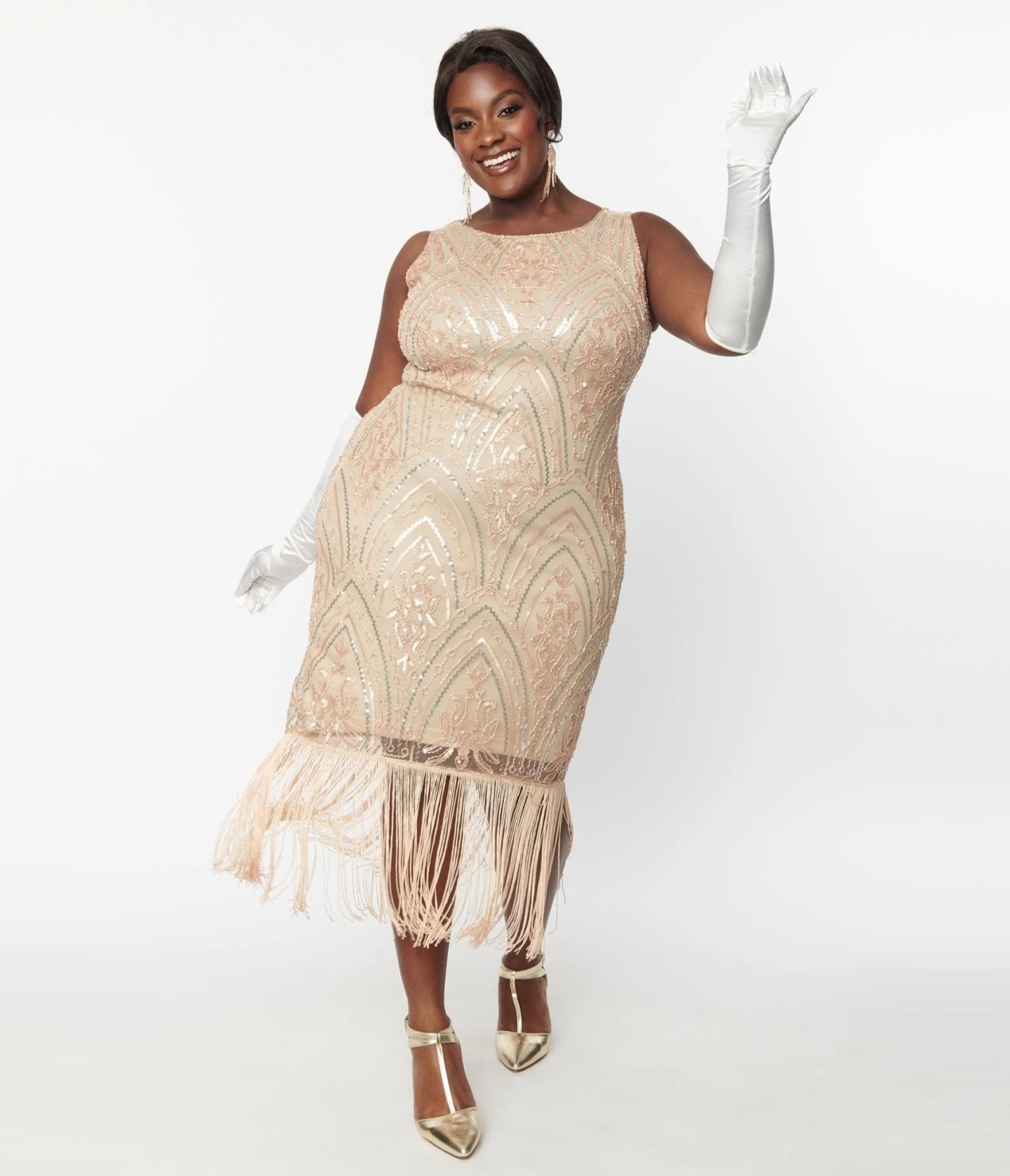 Unique Vintage Plus Size 1920s Champagne Sequin & Pearl Sleeveless Flapper Dress