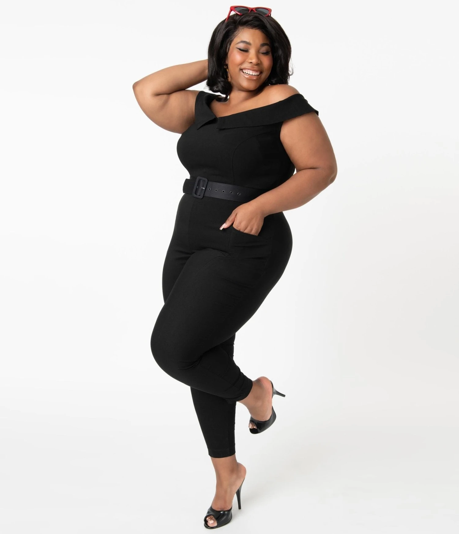 Unique Vintage Plus Size 1950s Black Off Shoulder Gillian Jumpsuit