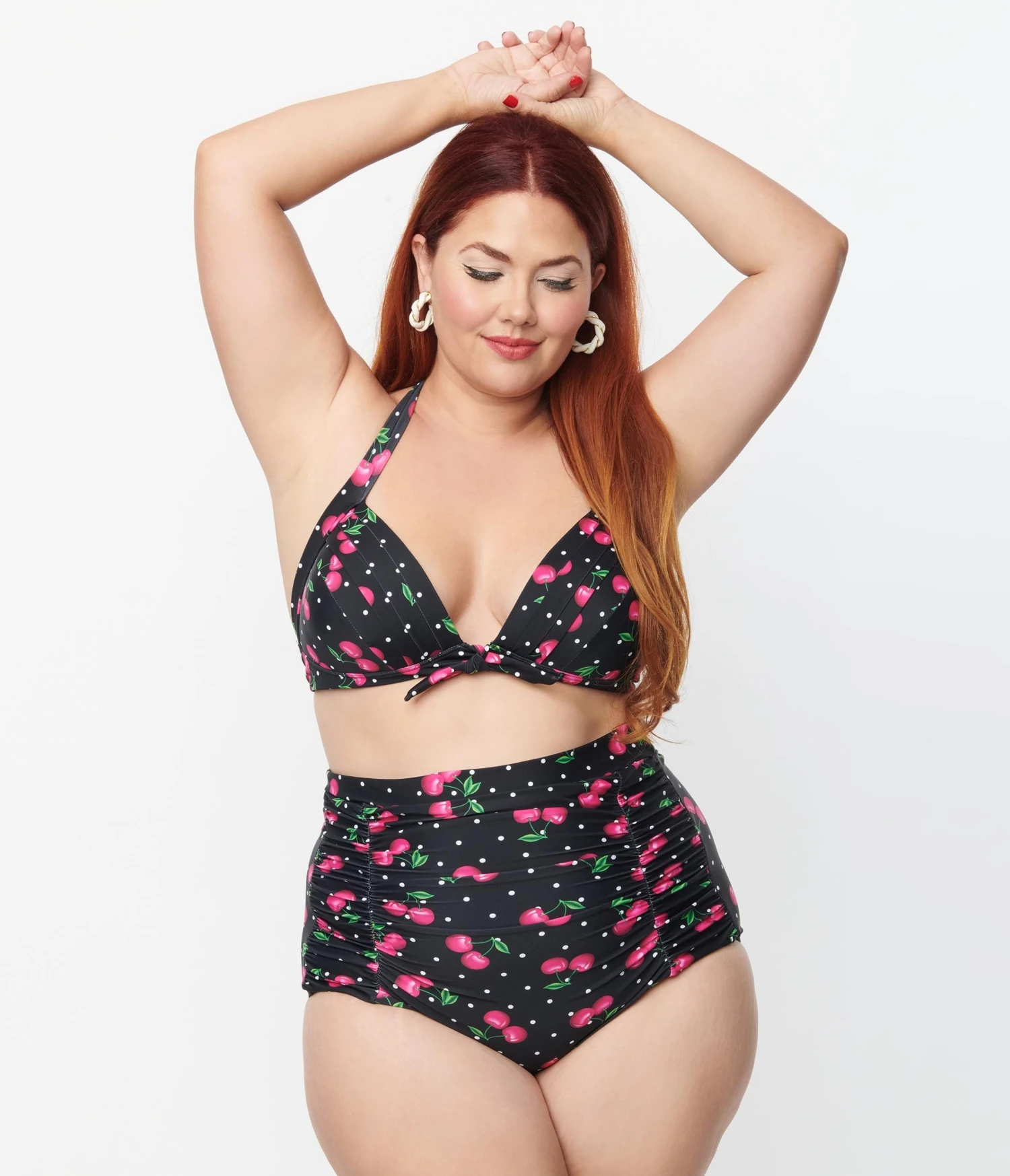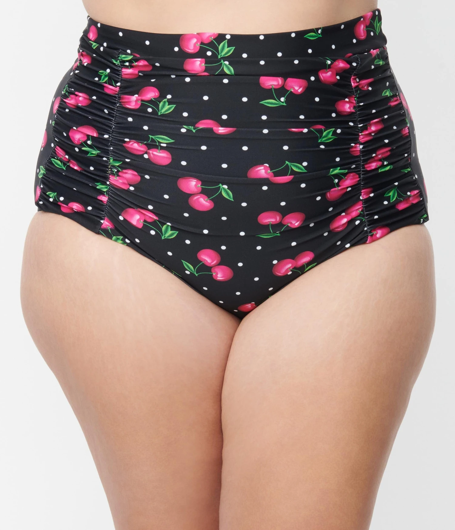 These high-waisted plus size swim bottoms feature hot pink cherries and white pin dots through a black backdrop. Outfitted with an elastic waistband and mesh lining.