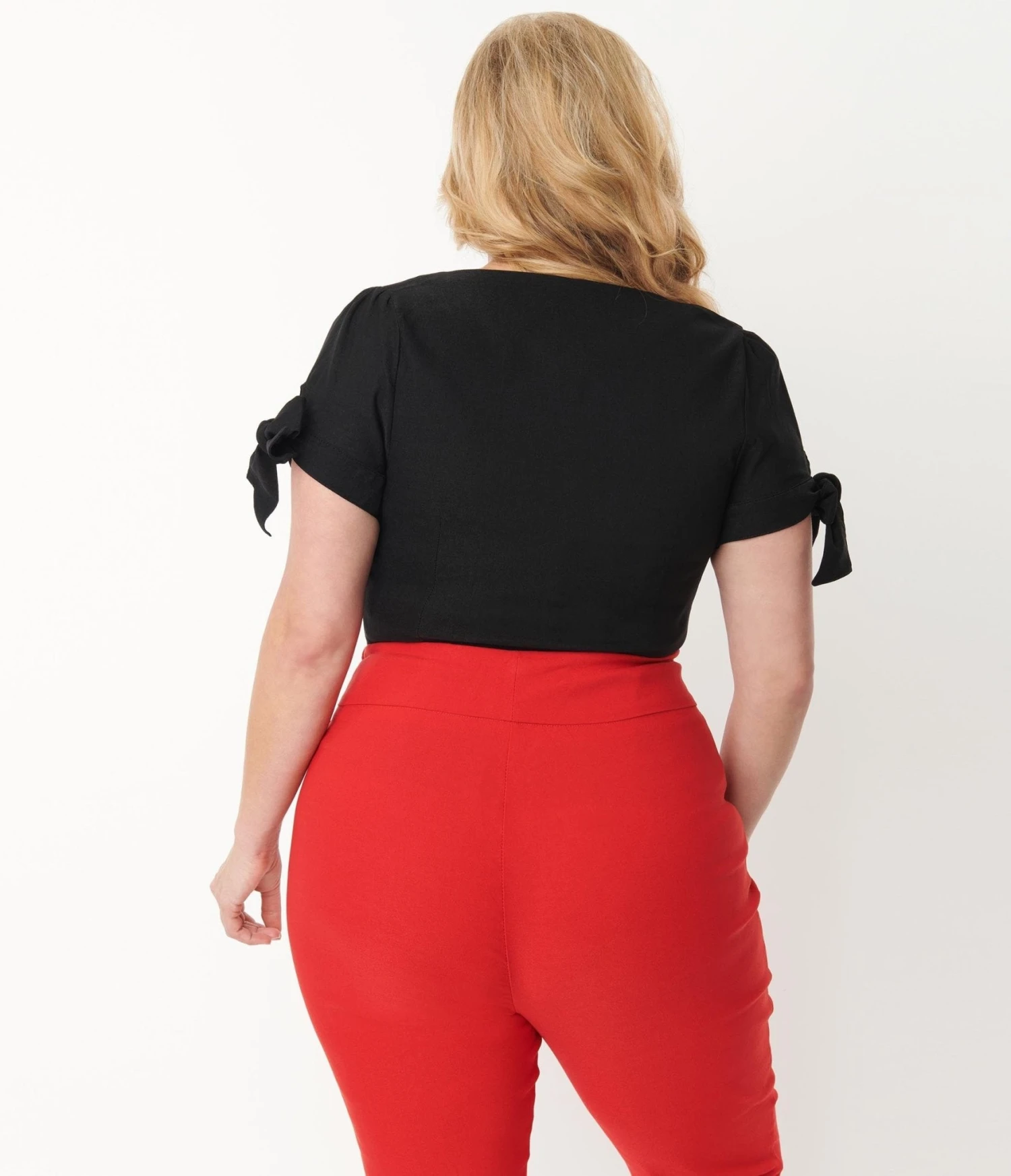 Set your desire to smoldering, dames! Place yourself in demand with a ravishing plus size separate from Unique Vintage, crafted in an eye-catching black. The Noreen Top is structured with a button up front that leads to a sultry sweetheart neckline and framed by daring short sleeves that boast a self tie keyhole cuff for added retro charm. The empire seamed waist tops a tapered silhouette that drops into a straight hemline that tucks easily into your favorite skinnies!