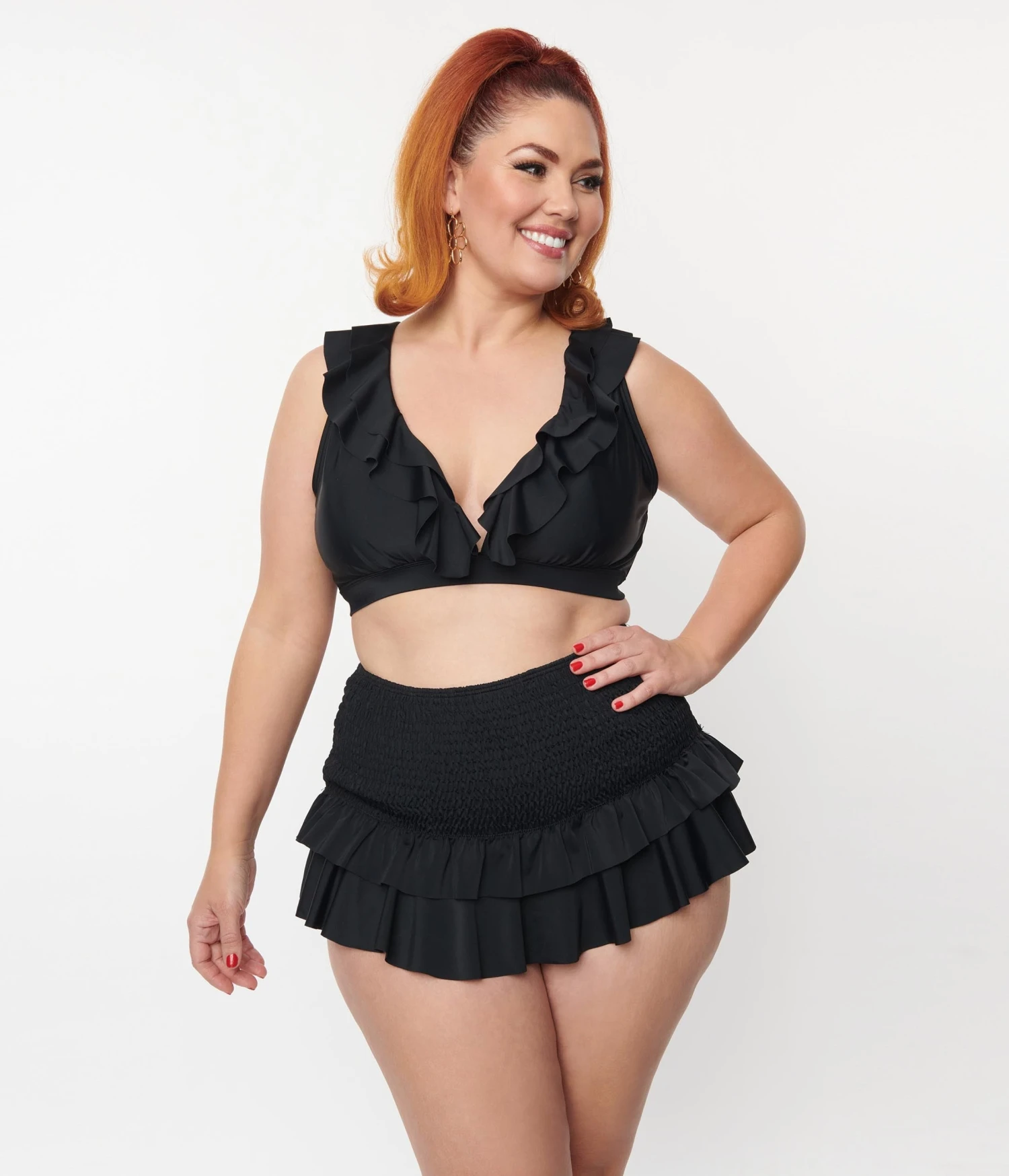 Unique Vintage Plus Size Black Ruffle Halter Swim Top