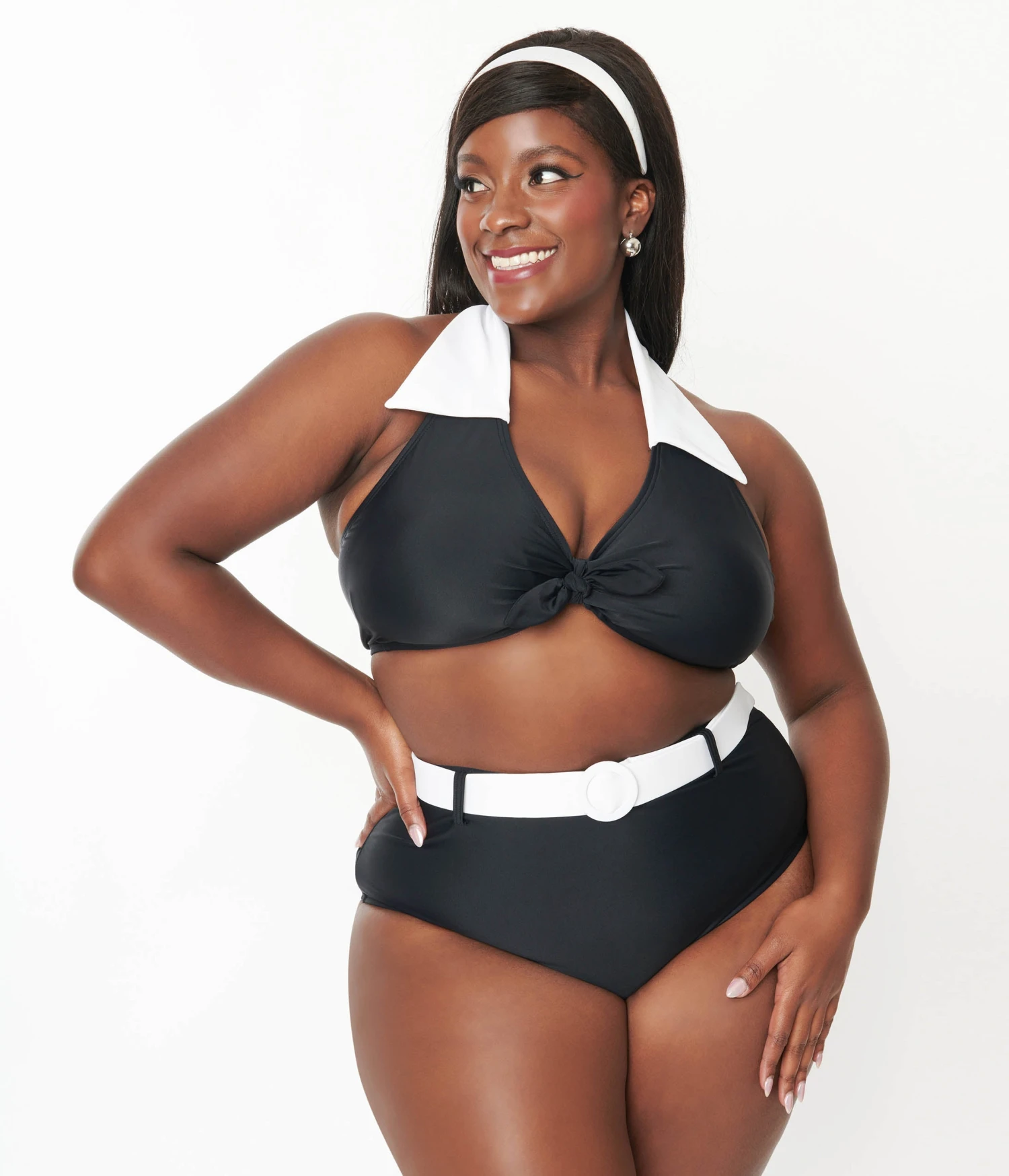 This charming plus size halter swim top is set in a solid black that boasts a collar in contrasting white. Complete with faux black front tie and hook back.