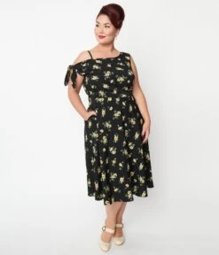 Unique Vintage Plus Size Black & Yellow Floral Bow Tie Swing Dress
