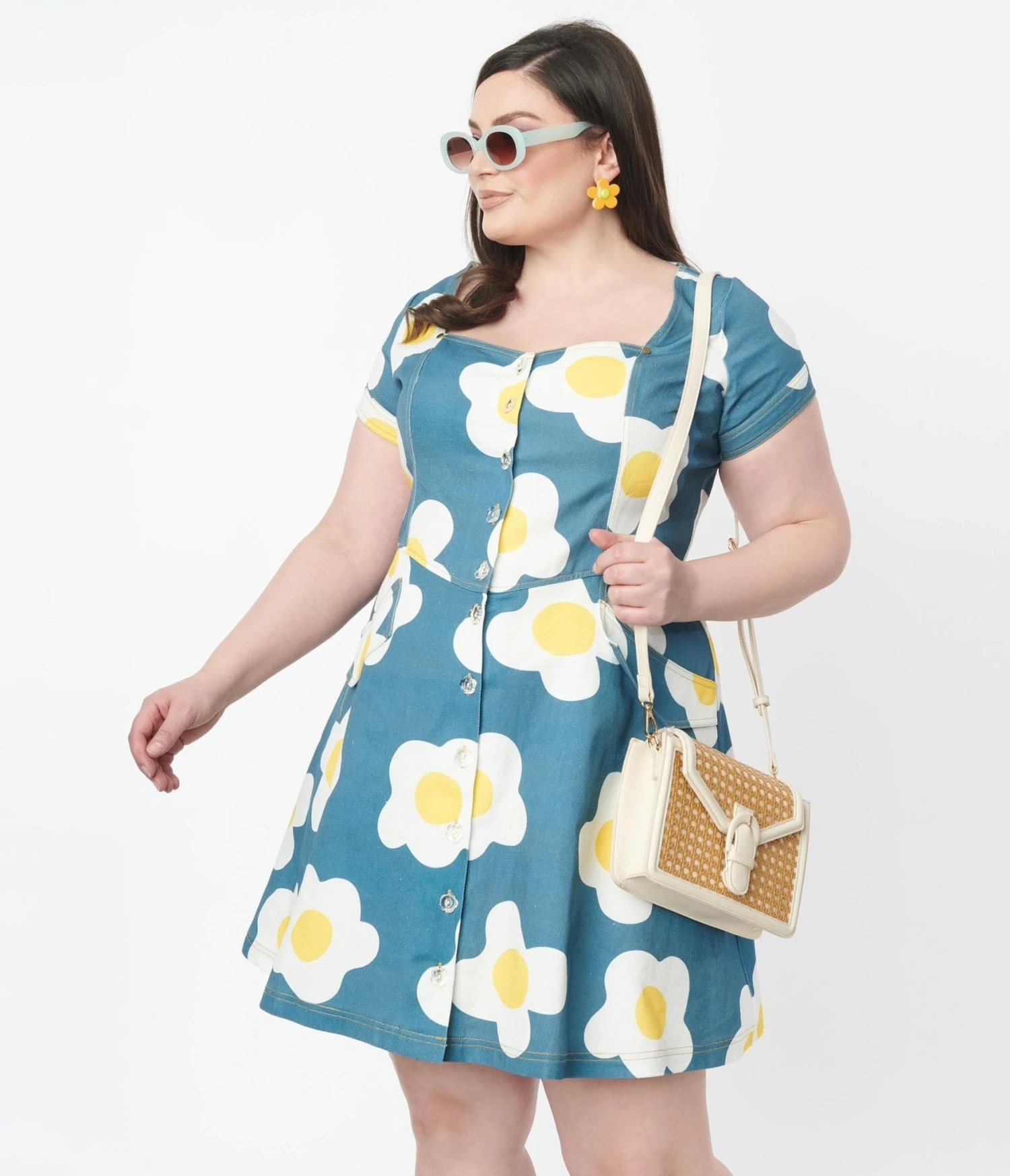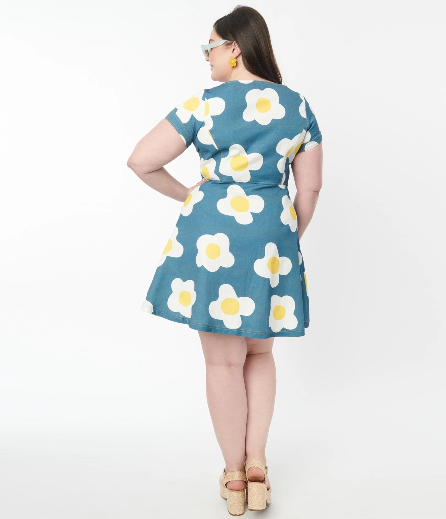 Unique Vintage Plus Size Blue Denim & Egg Flower Print Fit & Flare Dress