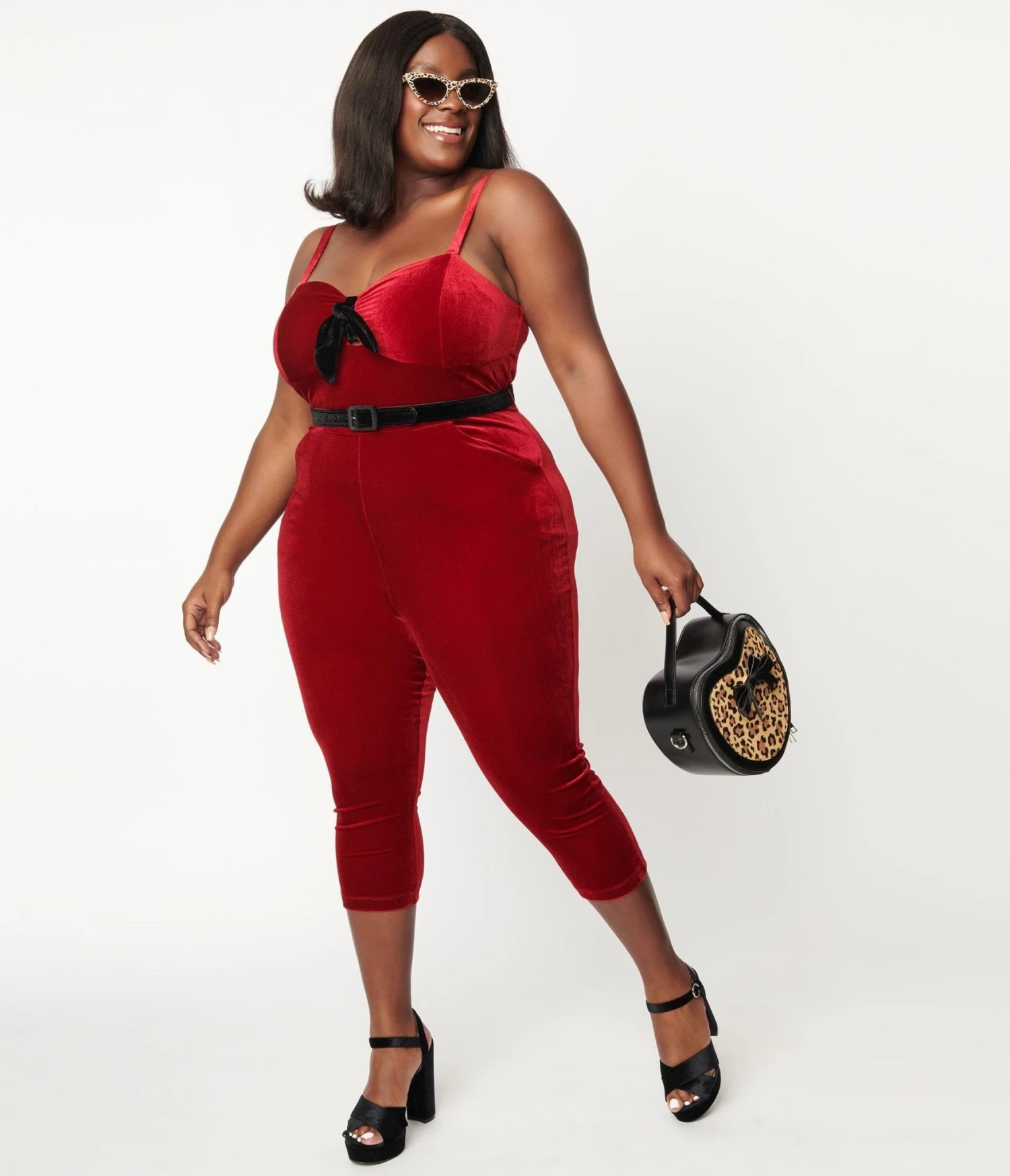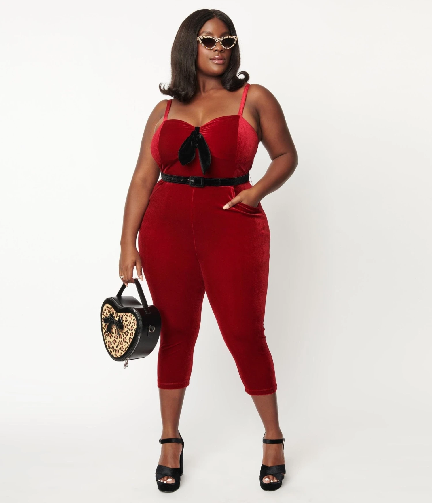 This sultry plus size jumpsuit is crafted in a luxurious burgundy velvet. Outfitted with adjustable spaghetti straps, side pockets, faux back pockets, and a sweet black velvet bow and belt. Complete with a back zipper and capri legs.