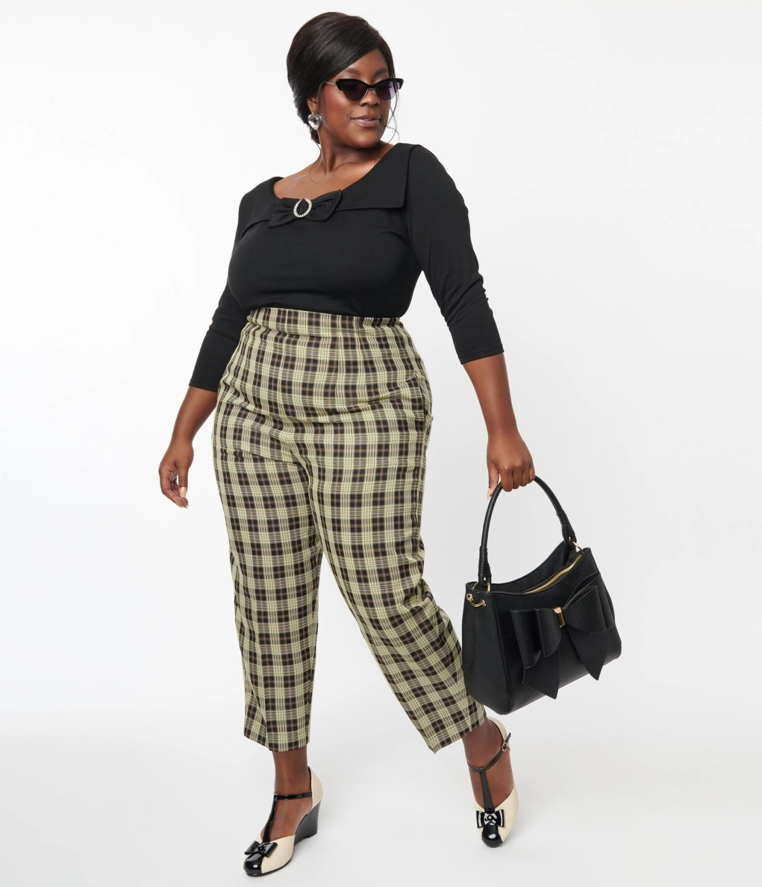 These charming plus size pants are crafted in a lightweight woven fabric that features plaid pattern in black, cream, and brown and boast a fabulous high waist silhouette. The straight leg silhouette is accented with front pleat detailing that elongates your legs, while the waist is cinched with a back zipper!