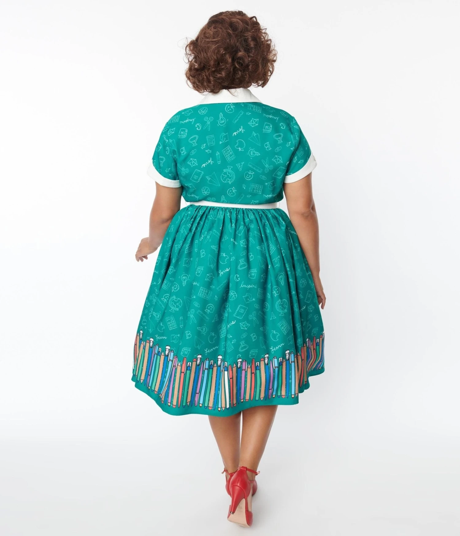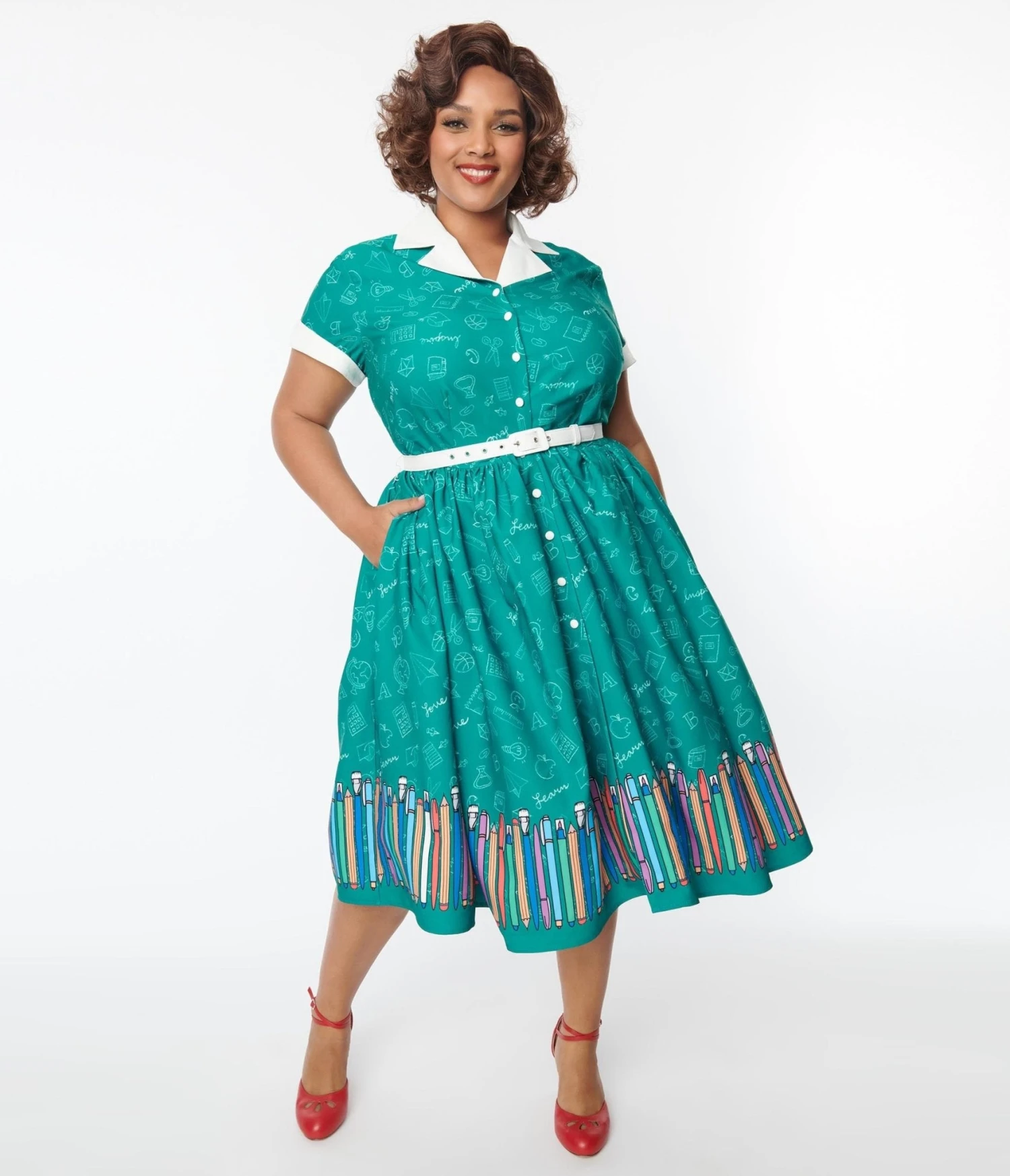 Class is in session! This adorable plus size swing dress is cast in a lightweight green woven fabric dancing with chalk doodles and boasting a colorful stationary border. Complete with a button up front, a belt, and side pockets.