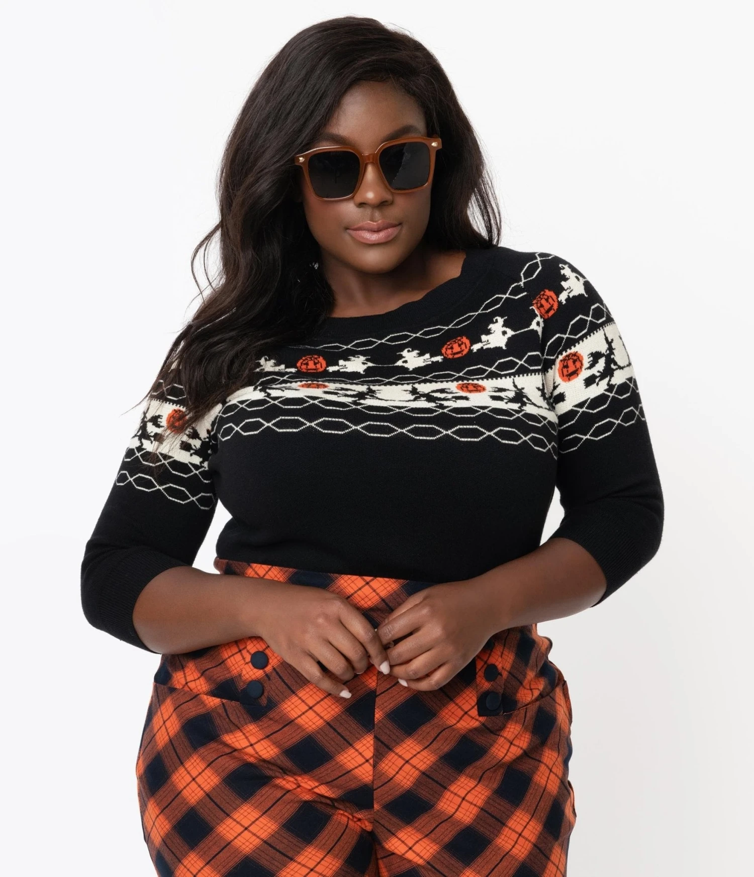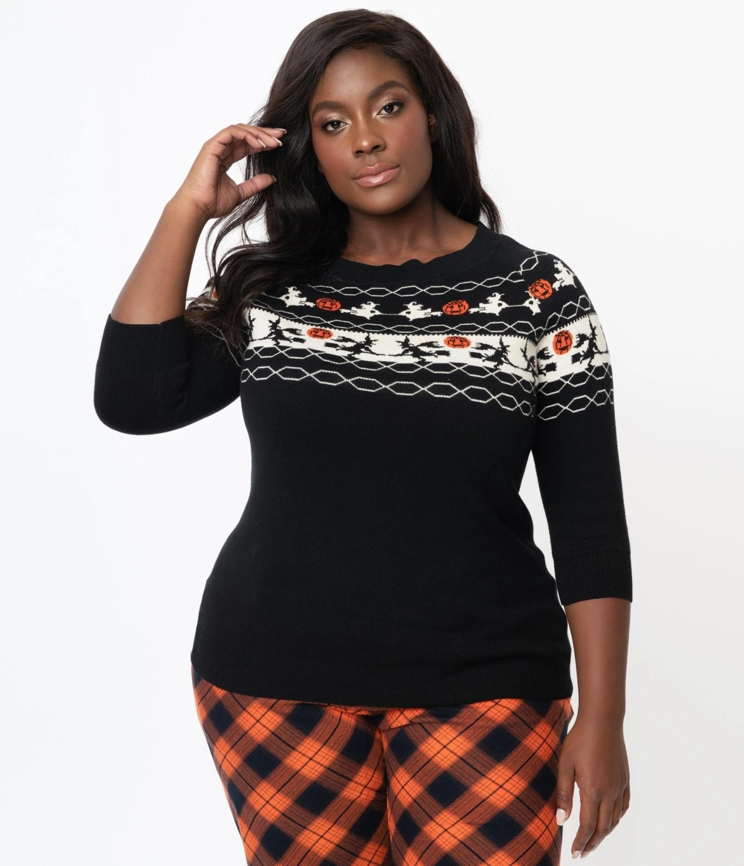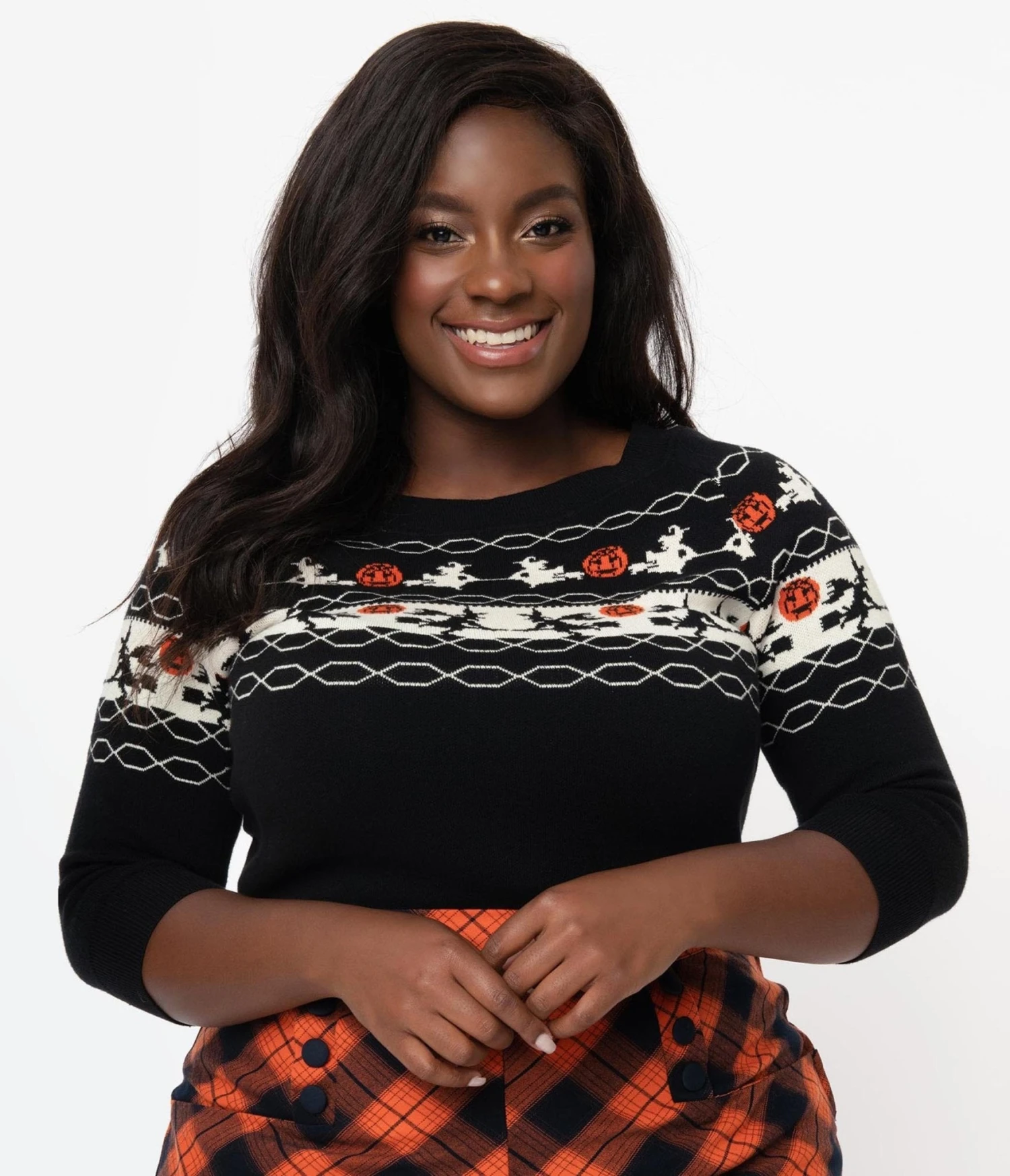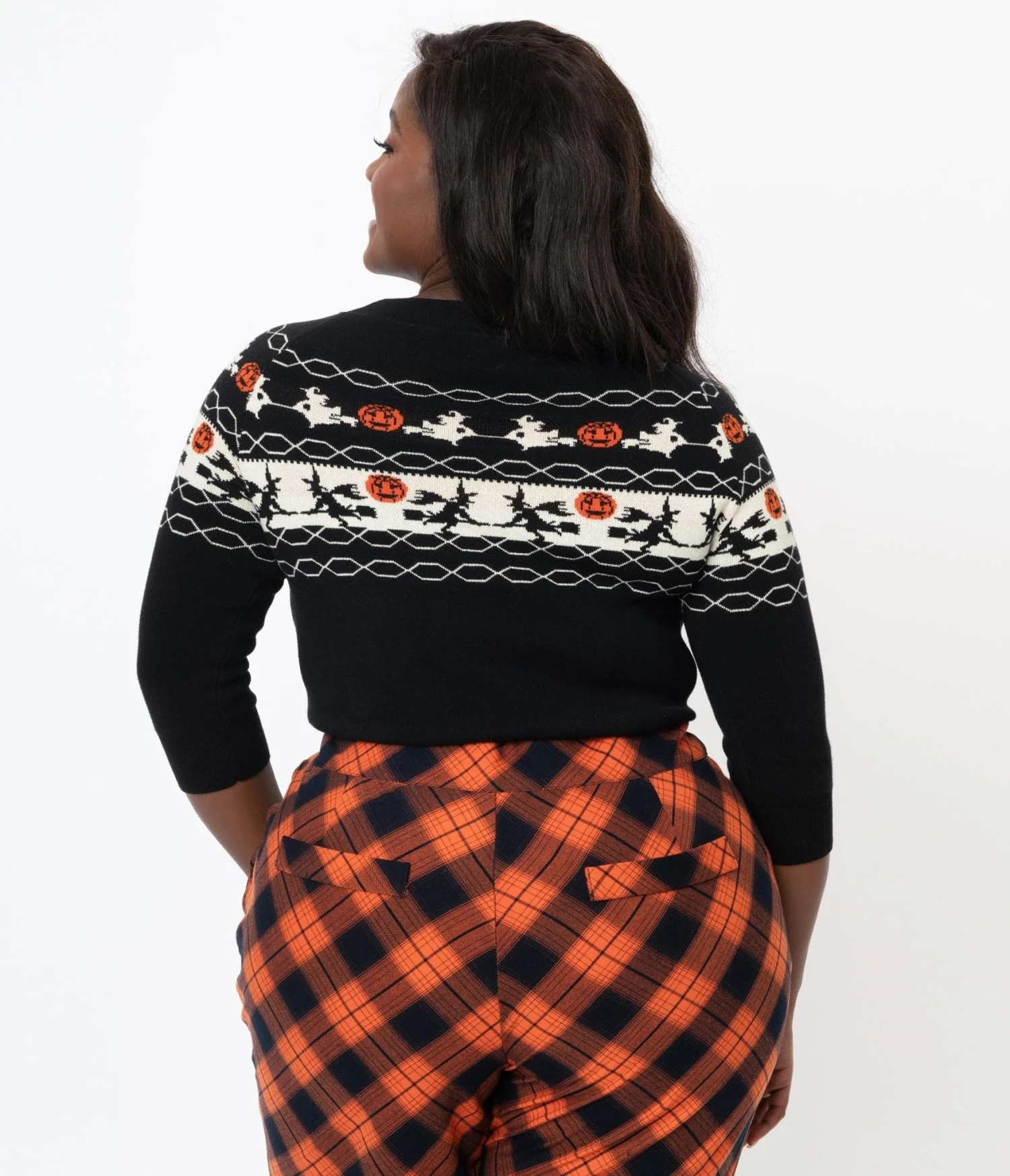 If the broom fits, fly it, darling! This sweet plus size knit sweater from Unique Vintage is crafted in a fabulous cotton blend for a night full of frights. A bewitching fair isle pattern of witches and jack-o-lanterns wraps around your figure while the scoop neckline is framed by slender three-quarter length sleeves to keep you cozy while casting your spells!
