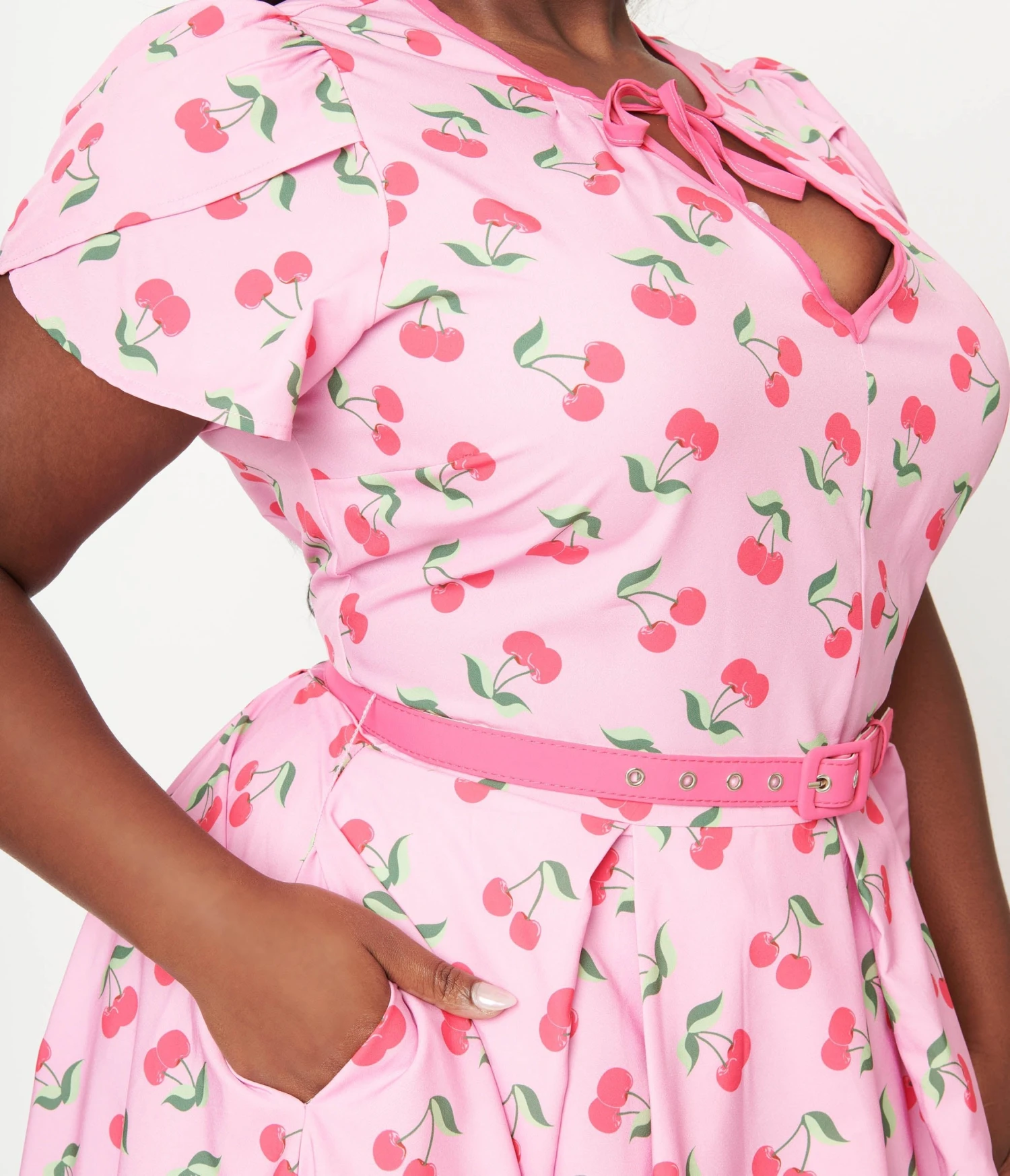 This 1940s style plus size swing dress is crafted in a lightweight woven crepe that dances with delicious hot pink cherries throughout the lavender backdrop. The bodice features a front self tie keyhole, framed by petal sleeves, while the belt nips in your figure. The swing skirt cascades past the knees while side pockets provide modern function, complete with a back zipper.