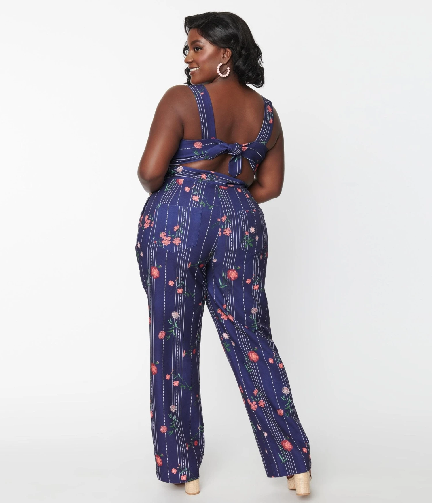 Defy the rules and stay stylish, dears! This sultry plus size 1970s style jumpsuit from Unique Vintage, is crafted in a sturdy woven blend that flatters your figure in a beautiful navy blue decorated with light stripes and florals. The princess seamed, sweetheart bodice is secured with adjustable straps while a back tie provide a sizzling peek-a-boo design. The banded high waist is cinched with button up sides while the relaxed straight legs are outfitted with back pockets for modern function!