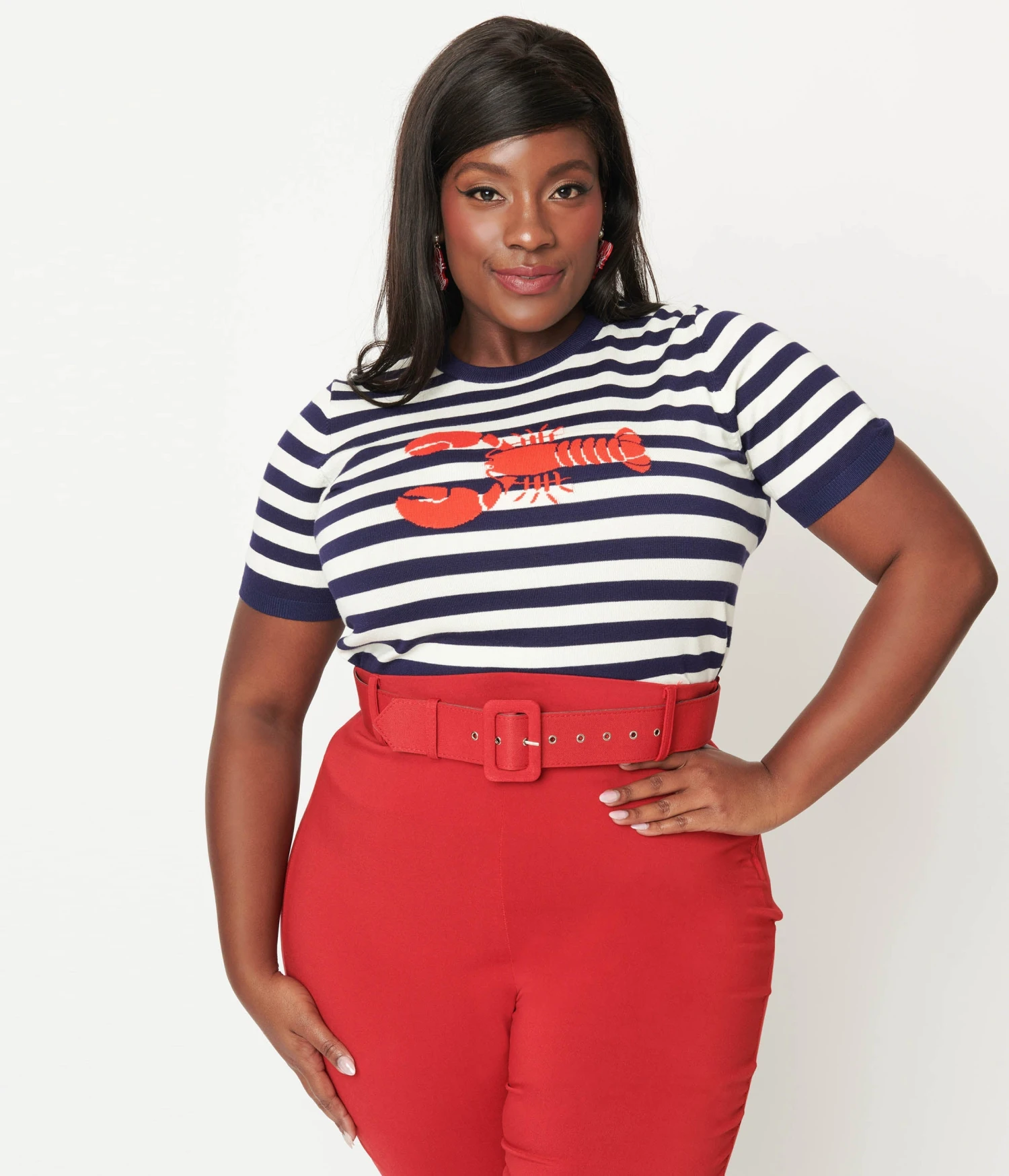 This adorable plus size sweater is crafted in a soft knit and set in navy blue and white stripes with a bright red lobster on the front.
