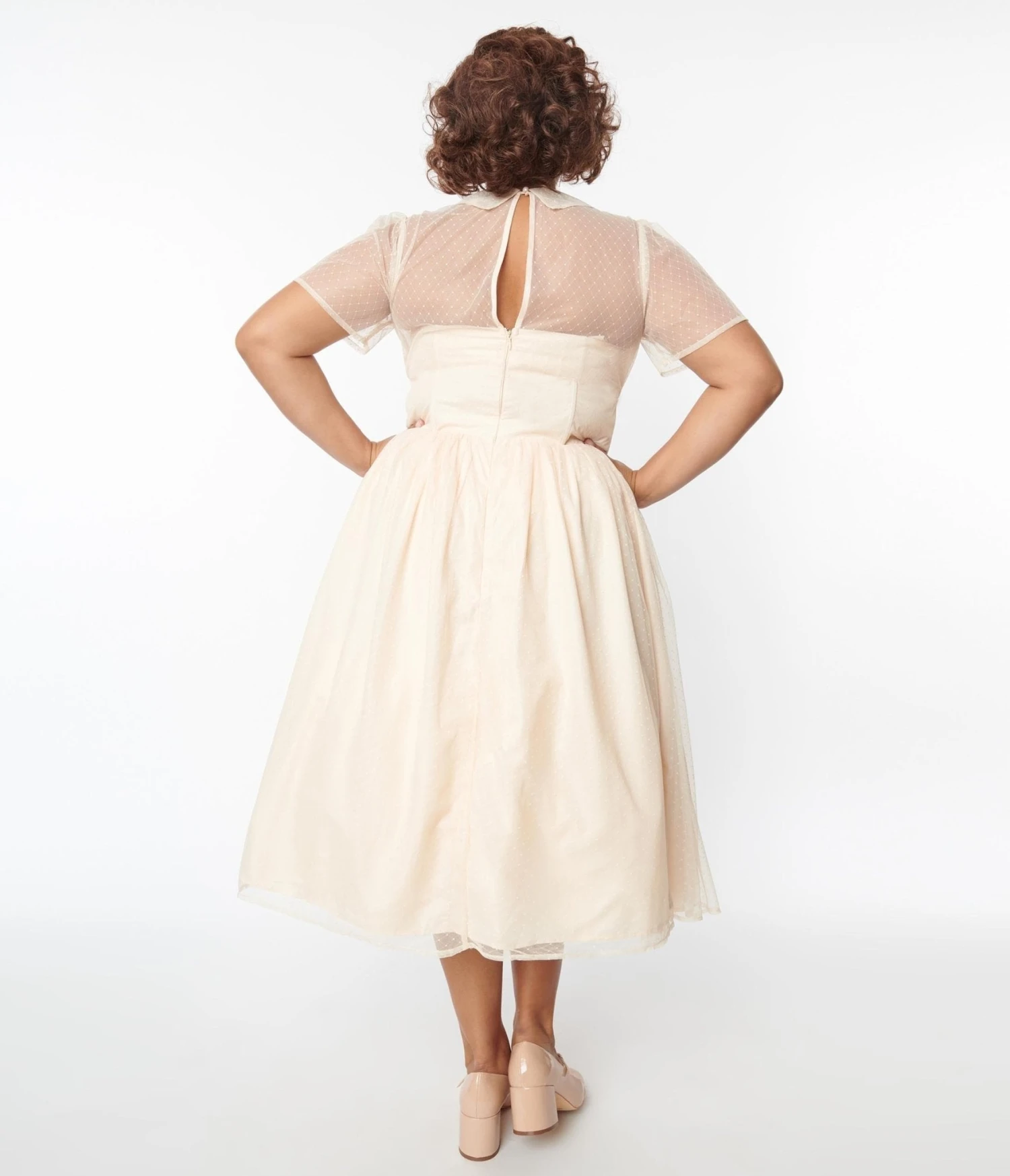 Aim for the sky, dears! Sweep them off their feet in the plus size Libby Dress from Unique Vintage, a delightfully mid-century piece crafted in a marvelous peach organza that dances with diamond clip dots throughout. The sweet heart bodice features subtle gathers over peach lining and framed by elegant short sleeves while the banded waist is cinched with a back zipper and topped by a button keyhole. The gathered swing skirt cascades past your knees for a romantic silhouette!