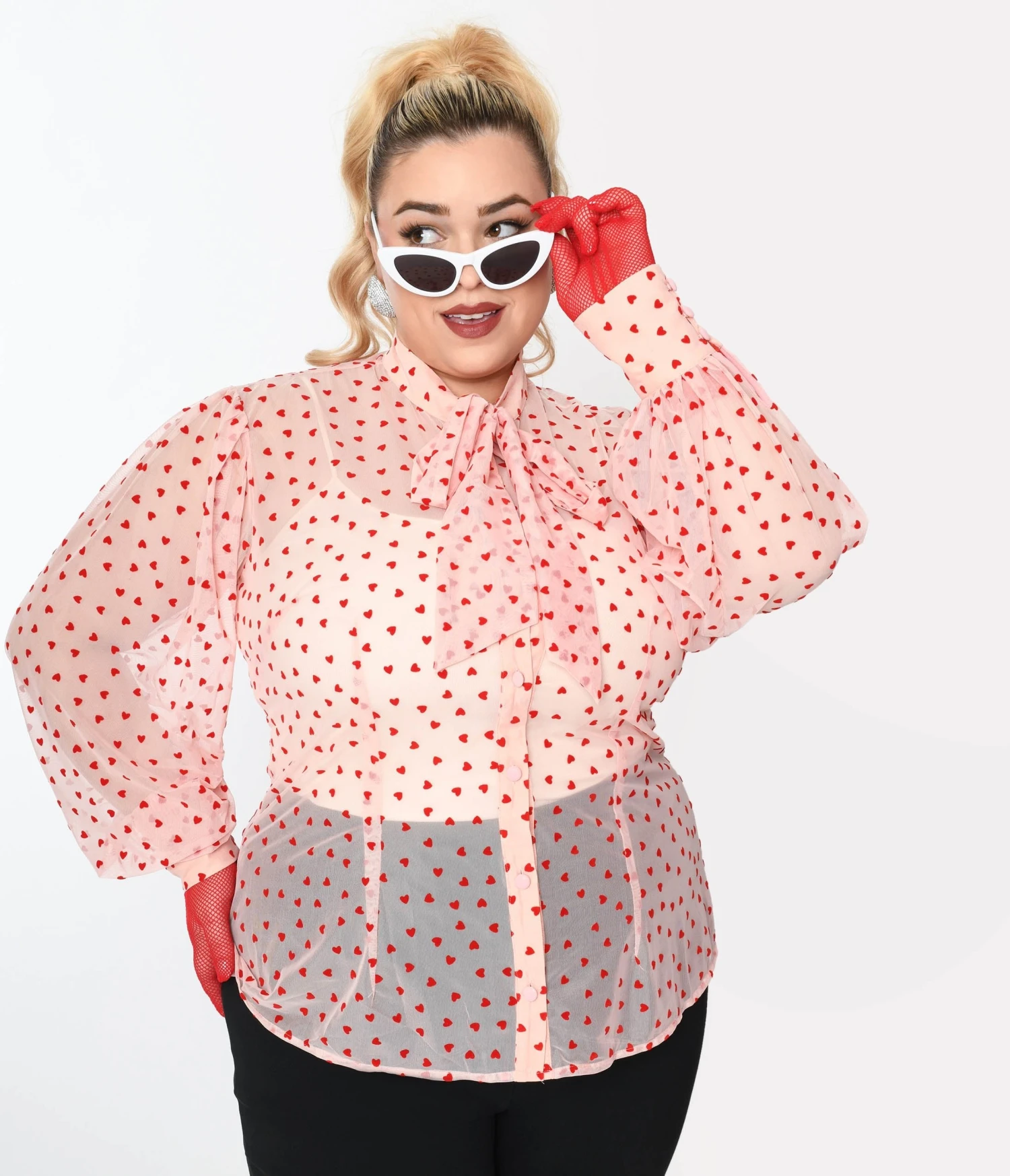 This charming plus size pink Gwen blouse from Unique Vintage features darling red hearts throughout adding an adorable touch to any outfit. The long sleeves feature button cuffs while the self-tie necktie adds a touch of class and completes the look. Complete with a button down front.