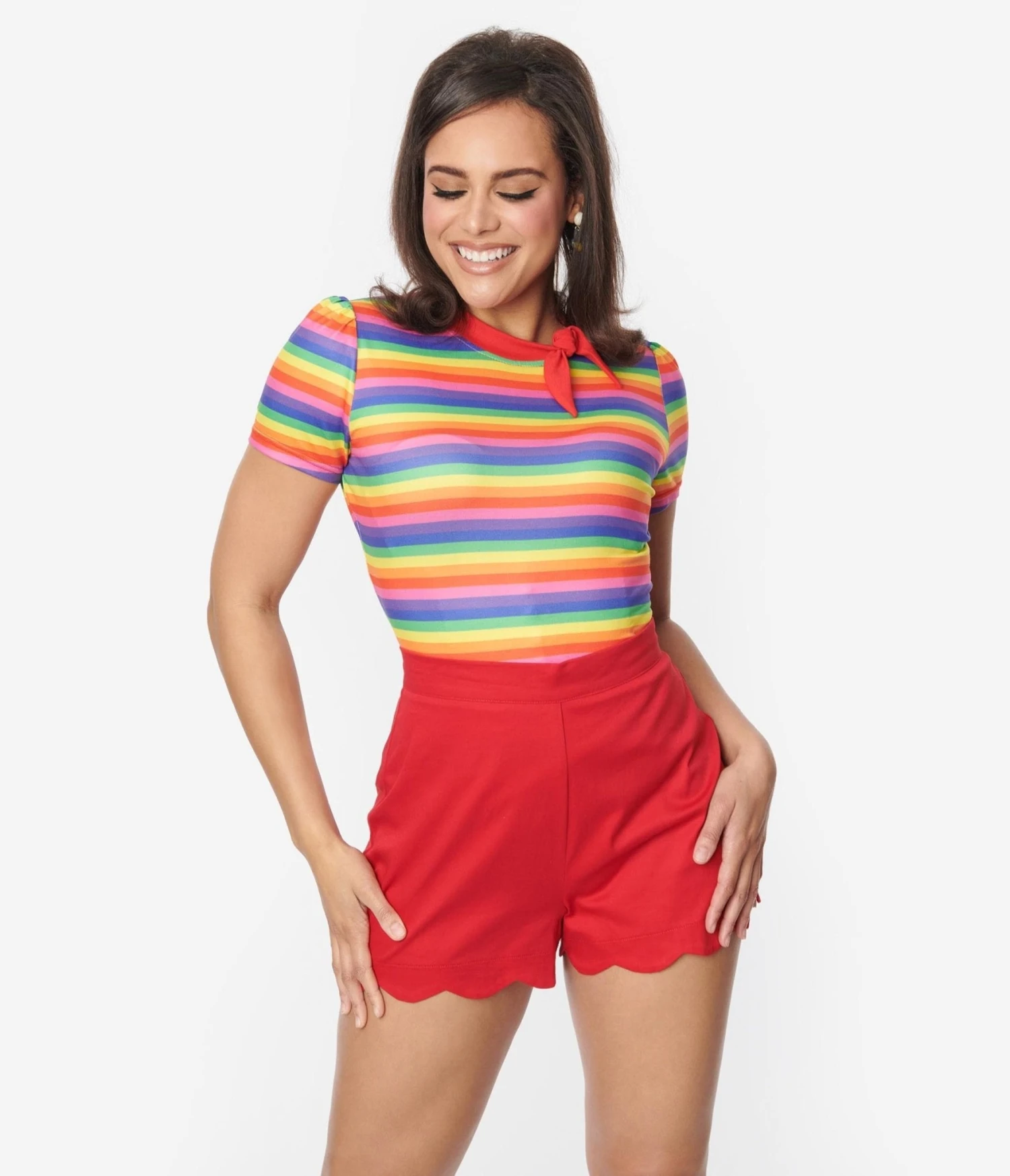 This sweet 1960’s style top from Unique Vintage is crafted in a fabulous rainbow striped knit. Outfitted with a modest neckline, attached red neck tie, and short sleeves.
