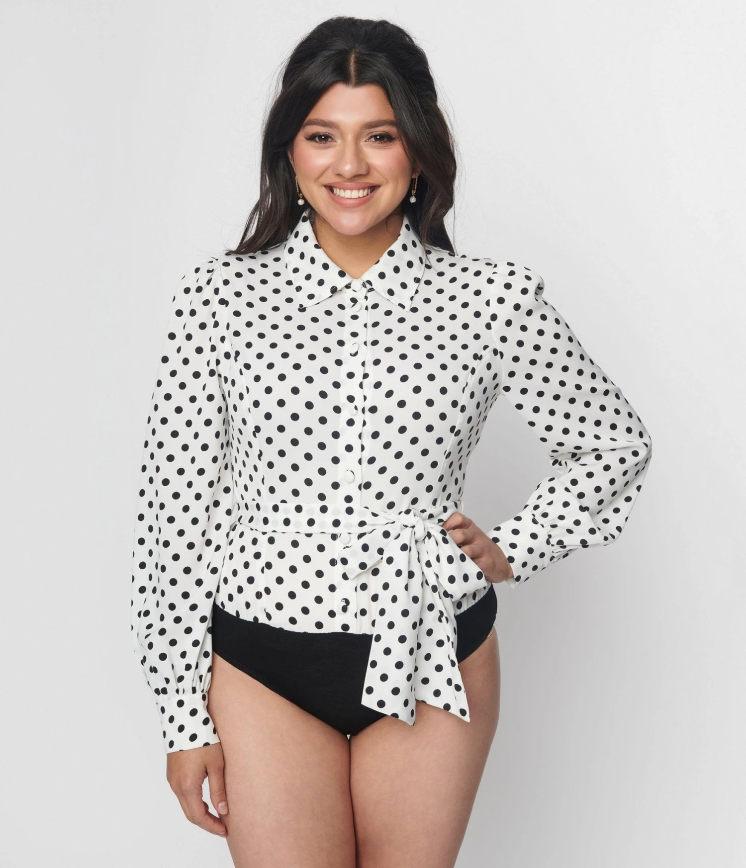 Unique Vintage White & Black Polka Sashed Bodysuit
