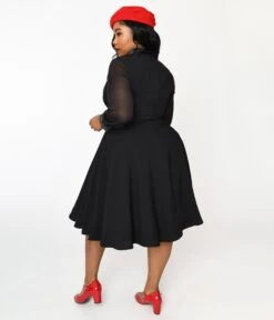 This gorgeous plus size black dress, crafted in a fabulous woven crepe with mid-century satin-like accents throughout. The surplice neckline is embellished with a notched lapel and framed by sheer long sleeves that drop into a button cuff. The banded waist is cinched with a mid back zipper as the sweeping swing skirt is outfitted with side pockets!