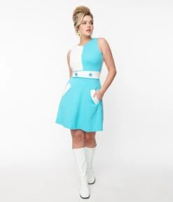 This 1960s inspired aqua blue and white colorblock mod shift dress from Voodoo Vixen is a stylish and comfortable option for going out and about. The dress features a scoop neckline, back zipper, and front pockets that add a practical touch to its chic design.