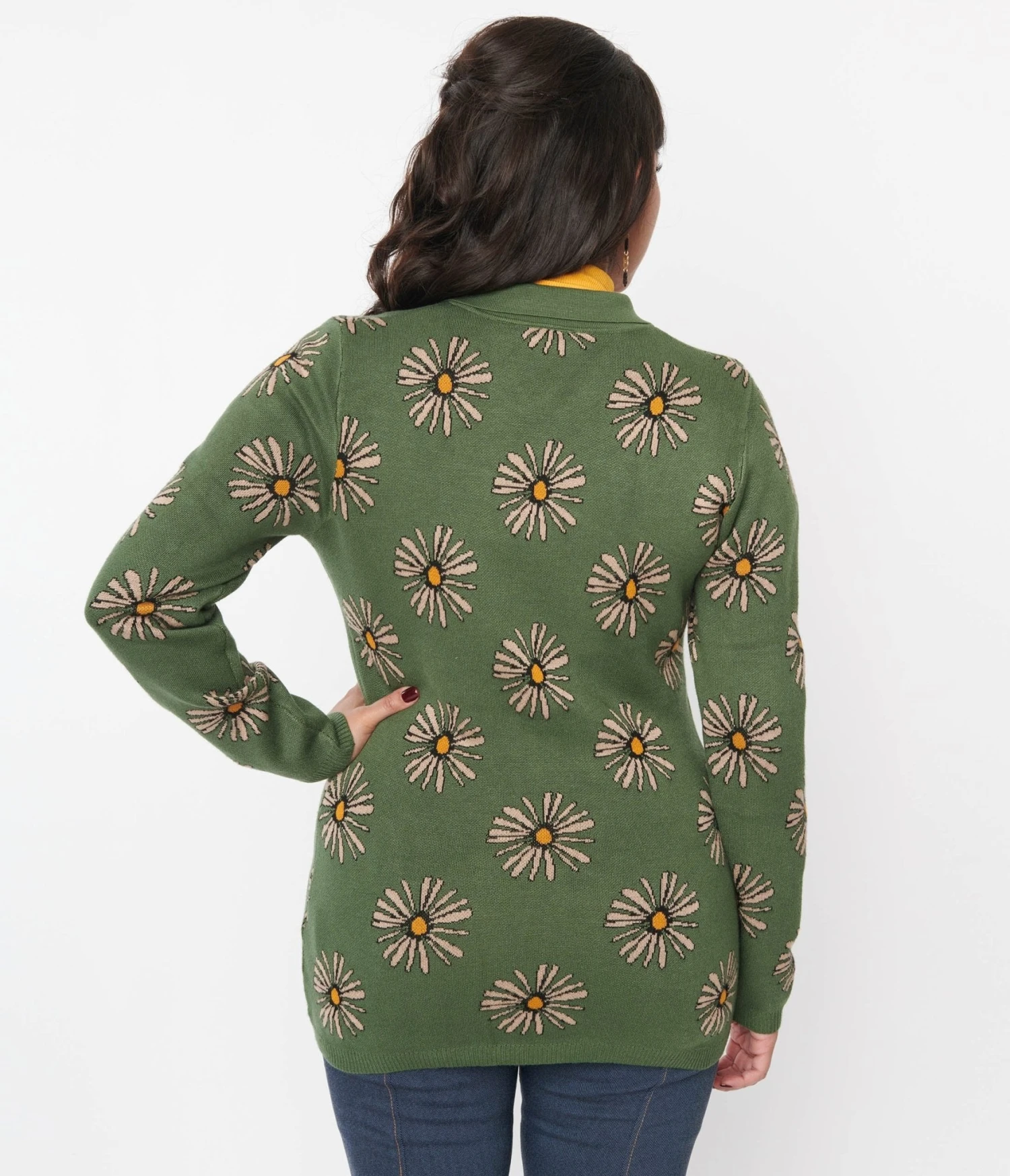 This delightful 1960s style olive green sweater knit cardigan boasts a captivating allover print of daisies, adding a touch of whimsy to your outfit. With its long sleeves and collared neckline, it’s perfect for those cool days when you need an extra layer of warmth. Plus, the front button-up design and handy front pockets make it both stylish and practical.