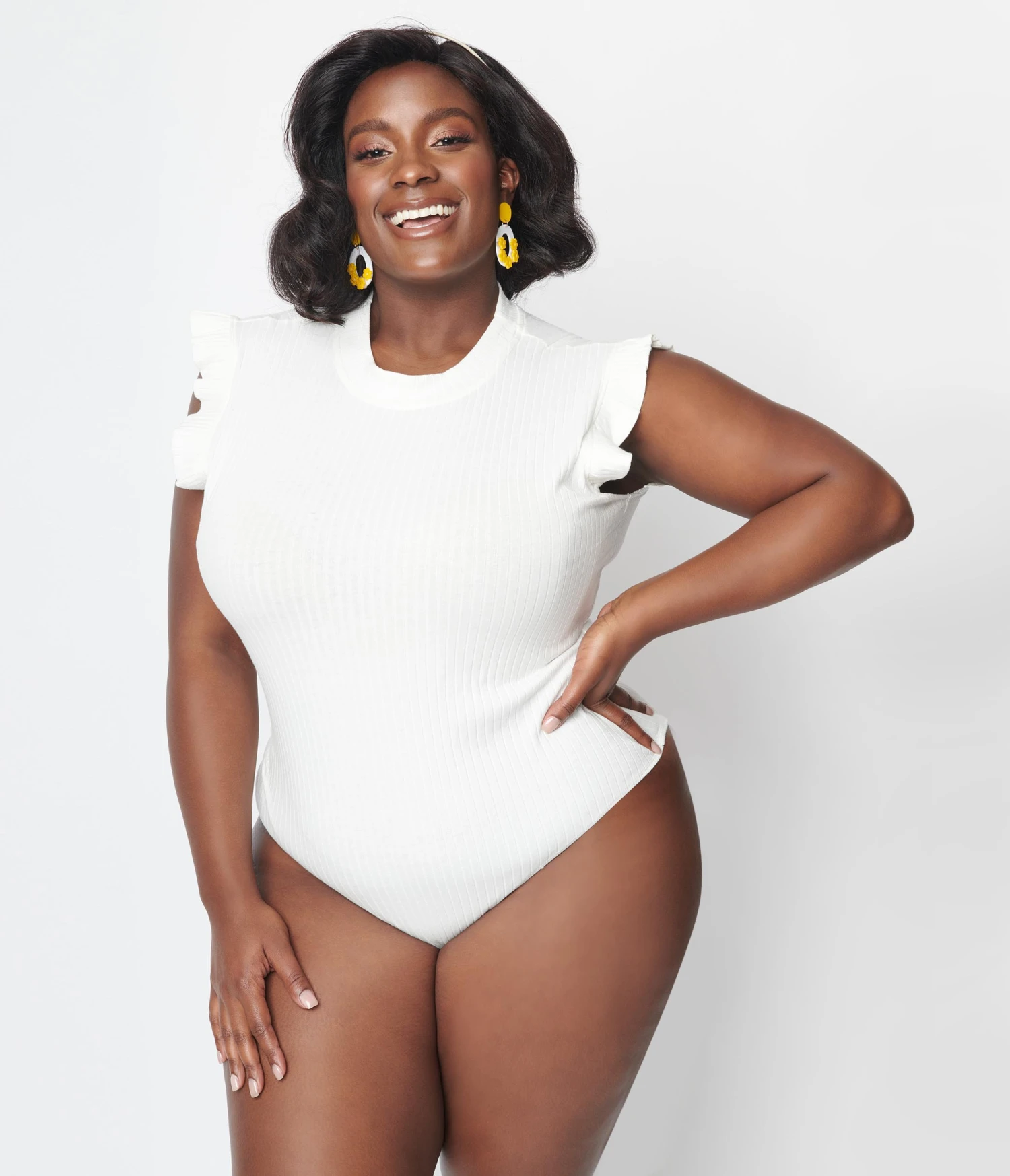 This sweet bodysuit is crafted in a solid white rib knit that flatters your figure. Boasting a gorgeous ruffle detail on the shoulders with a scoop neckline. This striking piece drops into a double snap button closure for a slimming silhouette!